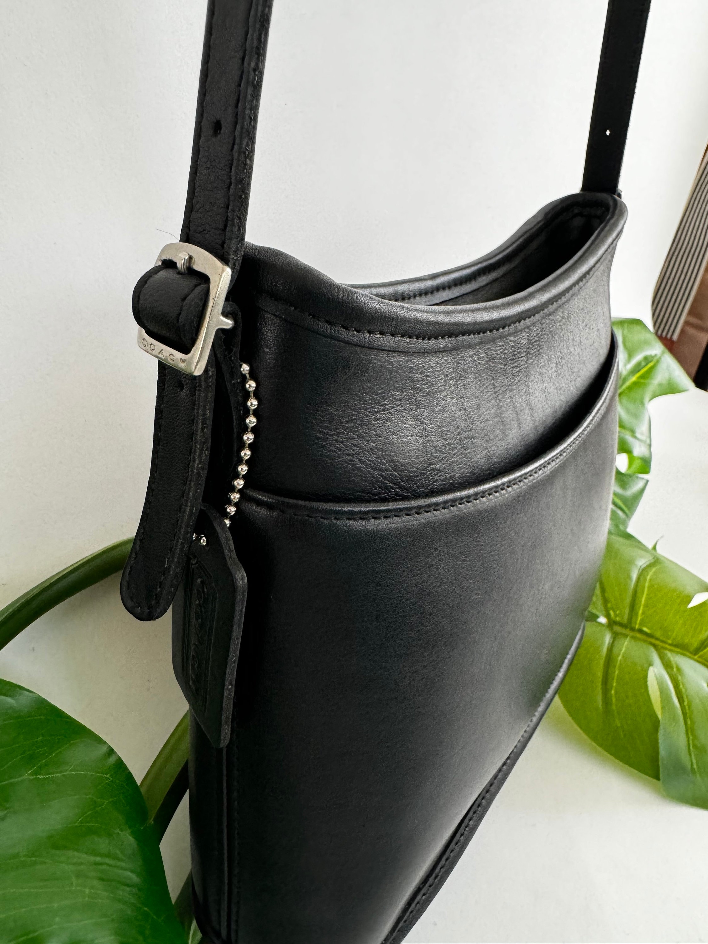 This Coach bag has thick, tanned, gloved leather that is soft and smooth. Solid brass hardware. It is marked w/ an embossed creed/label that indicates this bag was made in the USA before 1998