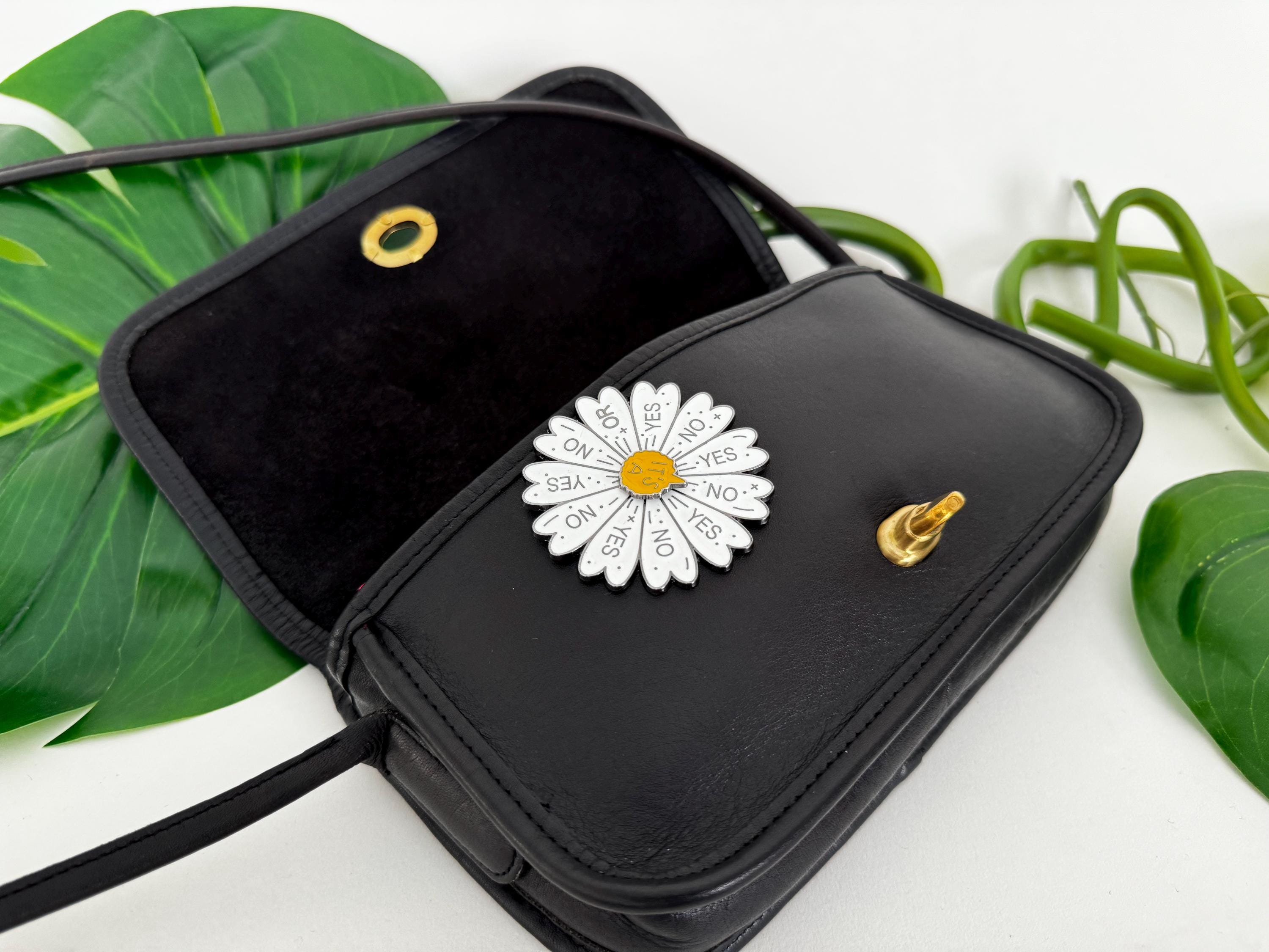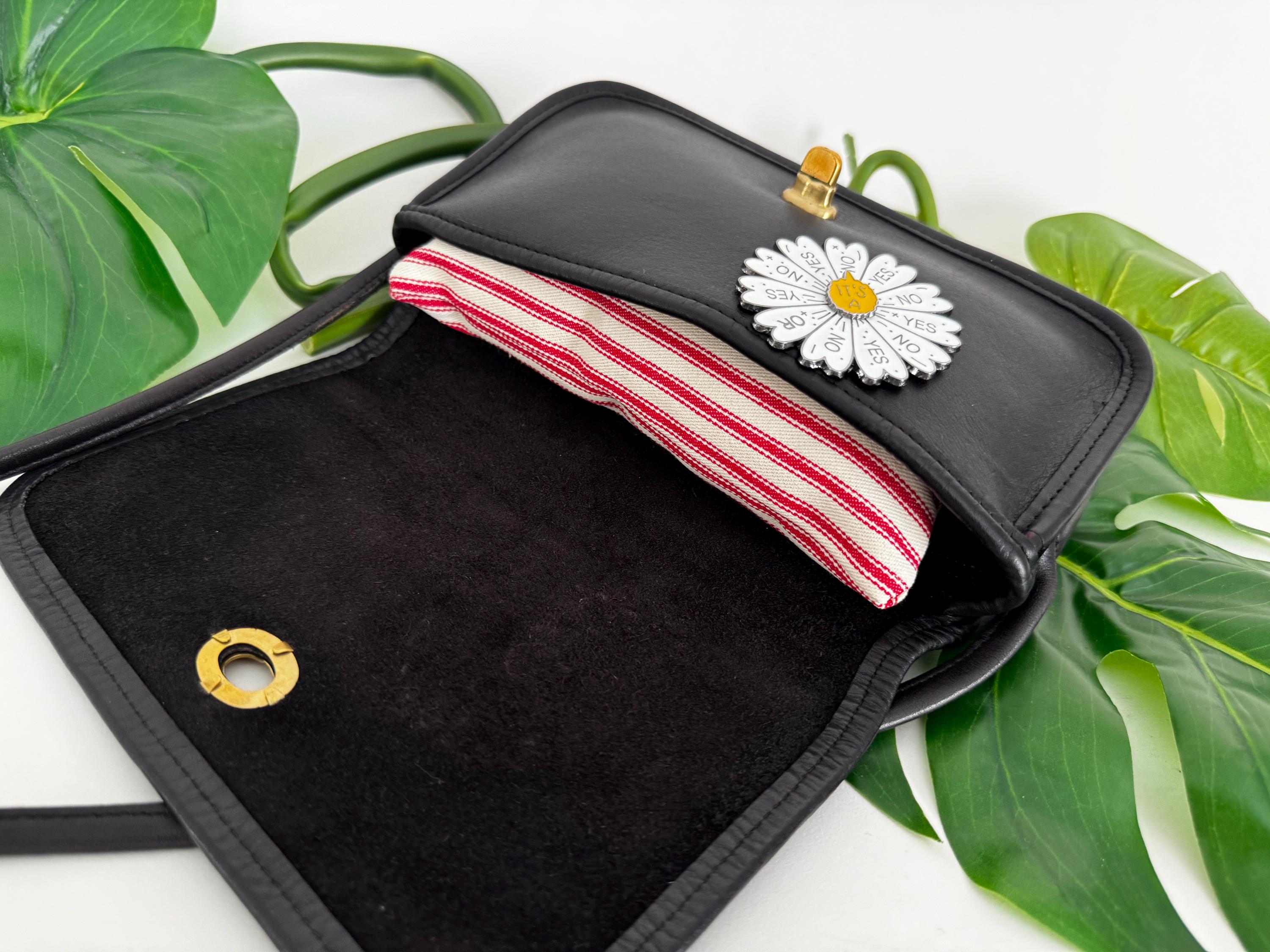 *This custom bag is in good vintage condition with signs of wear. Please review the photos before making a purchase. The enameled pin embellishment has created puncture holes and is securely clasped closed. This custom bag is not intended to be used without the pin.