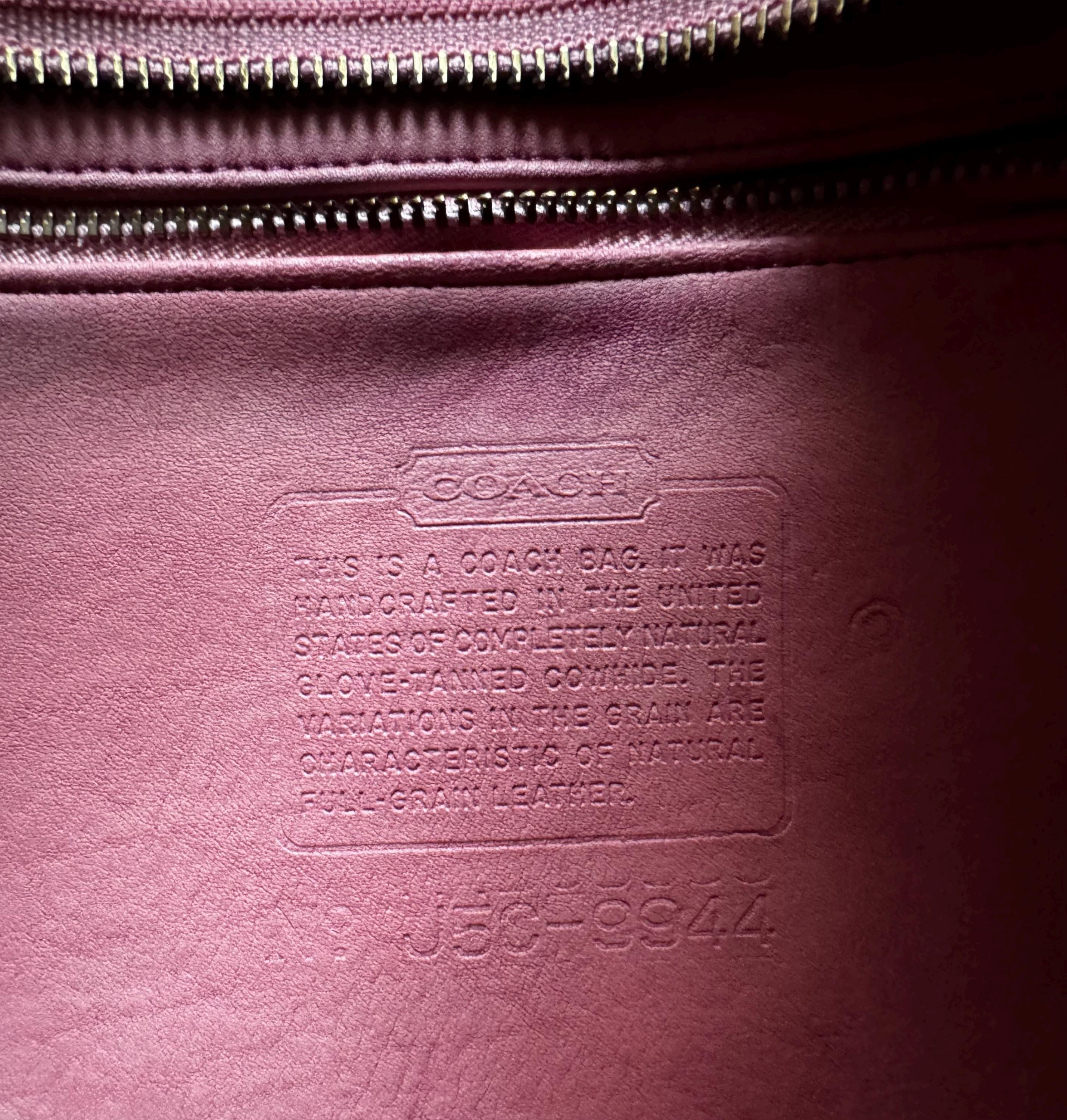 This Coach bag has thick, tanned, gloved leather that is soft and smooth. Solid brass hardware. It is marked with an embossed label that indicates this bag was made in the USA, 1995