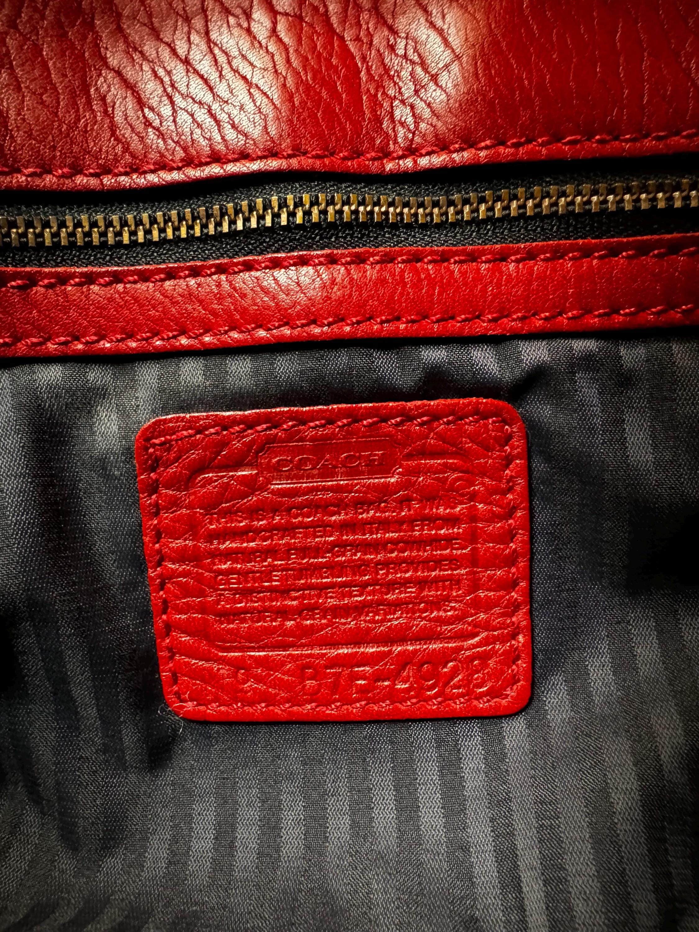 This Coach bag has thick, tanned, gloved leather that is soft and smooth. It is lined with cloth & solid brass hardware. It is marked w/ an embossed creed/label that indicates this bag was made in Italy in 1997