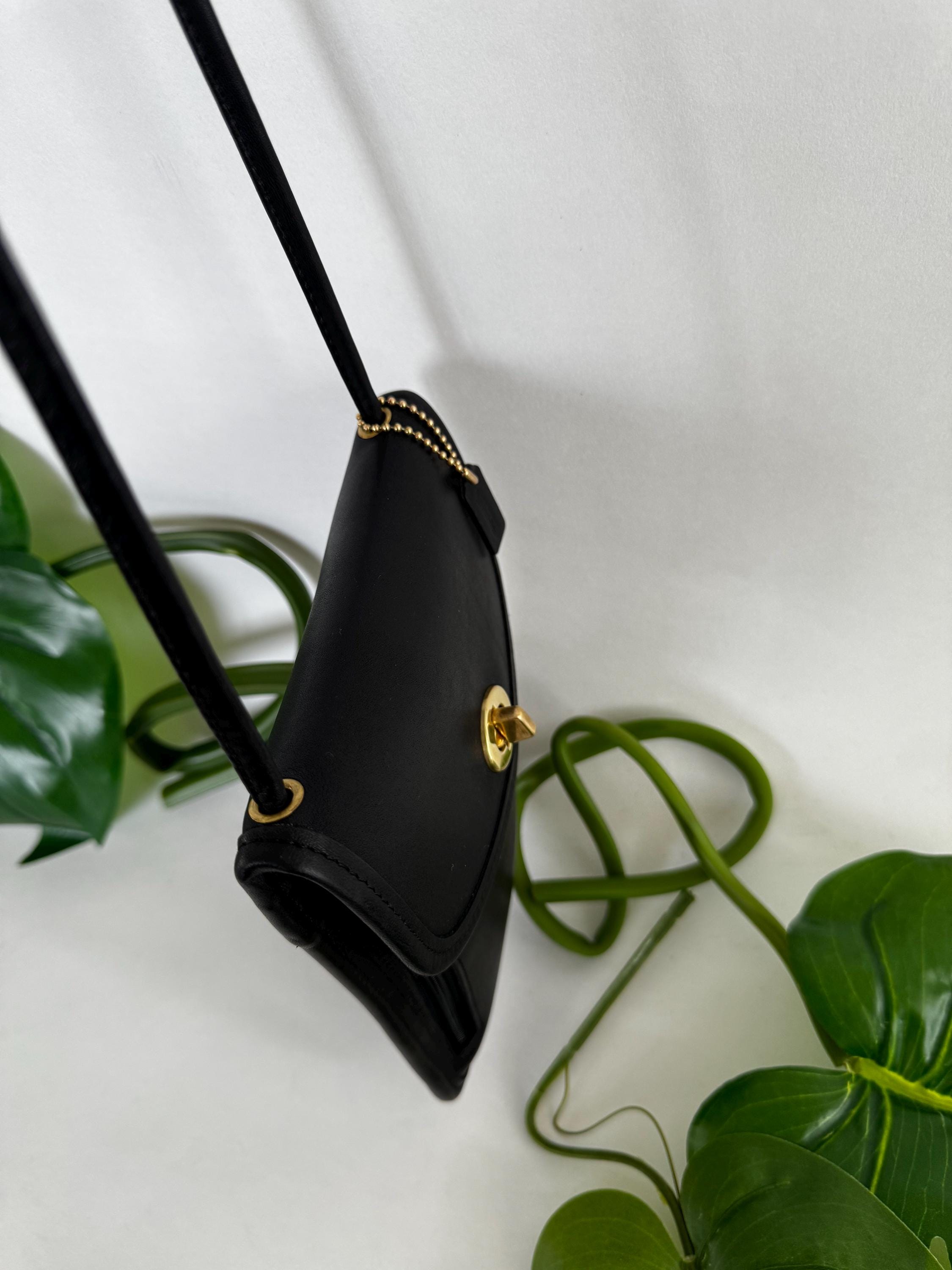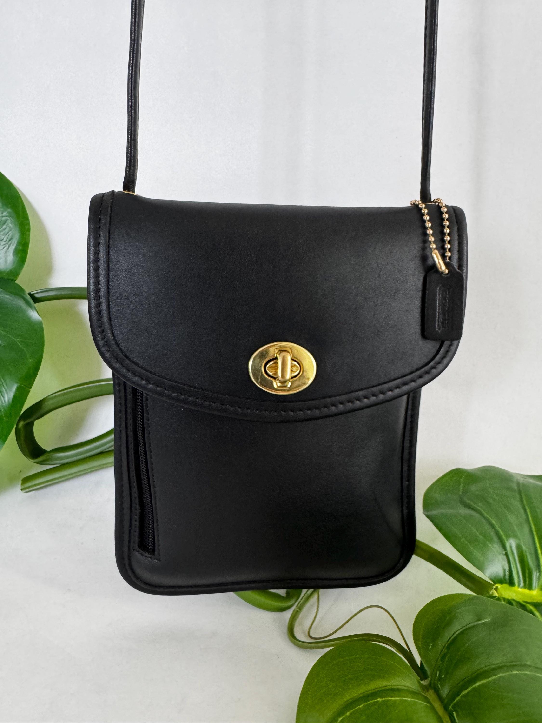 Turn key closure Outside zip pocket Strap with 28 1/2" drop Mini coach hang tag