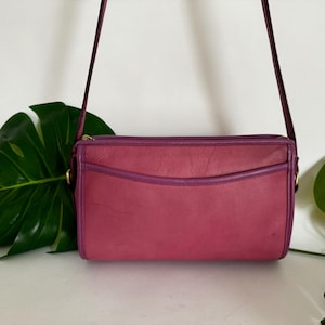 This Coach bag has thick, soft, and smooth leather with brass hardware. It is marked with an embossed creed and serial number that indicates this bag was made in the USA pre-1992