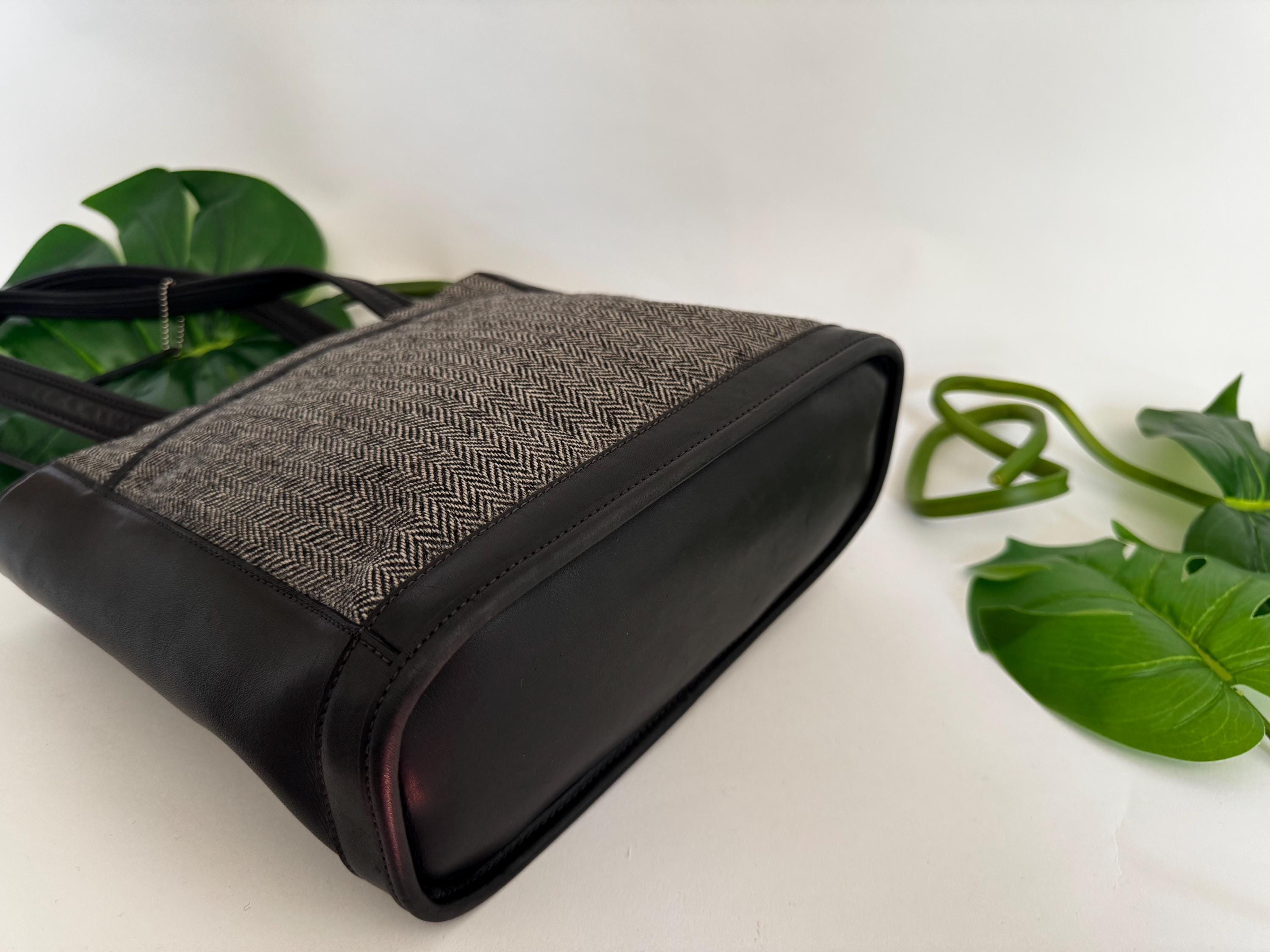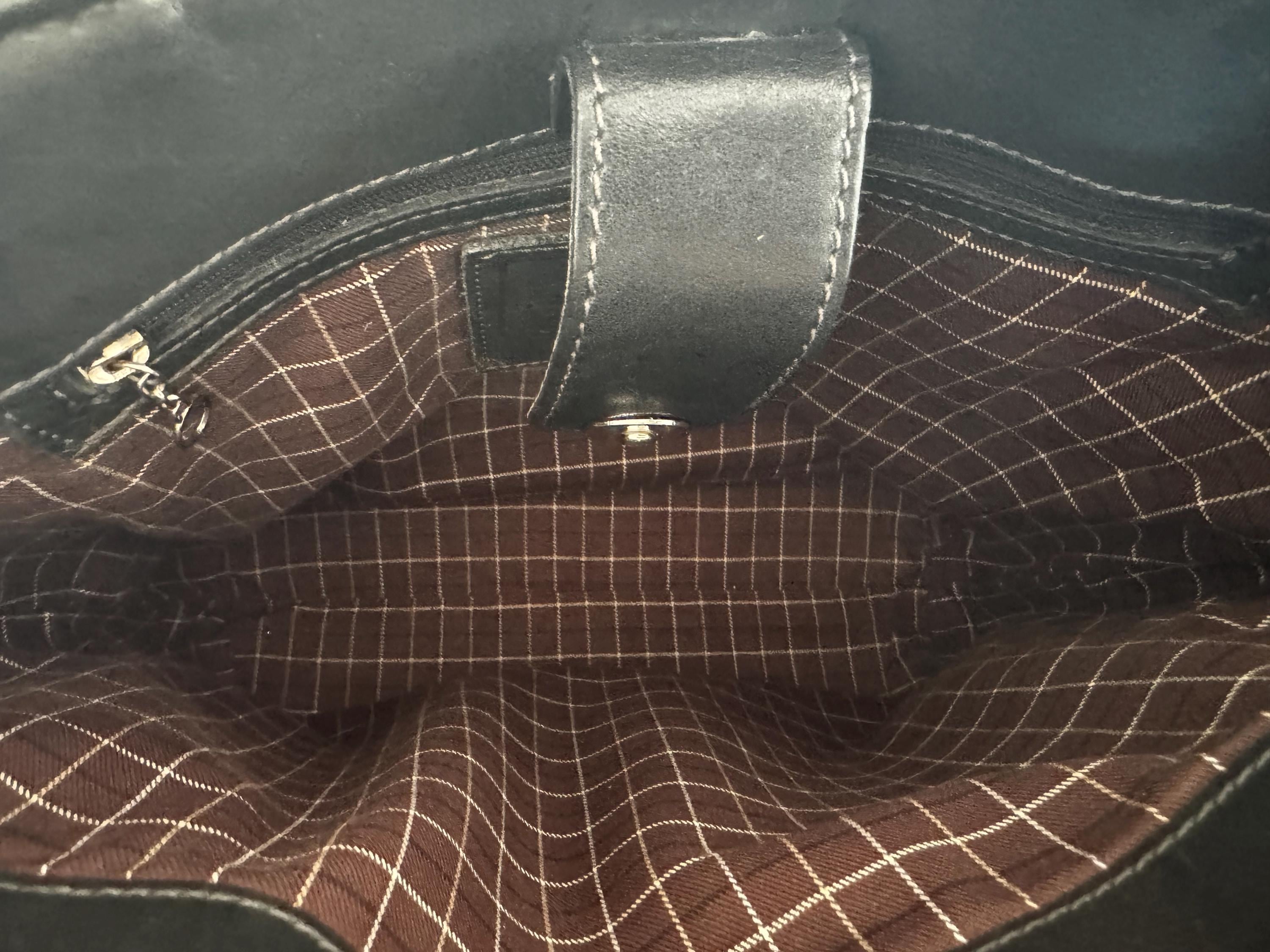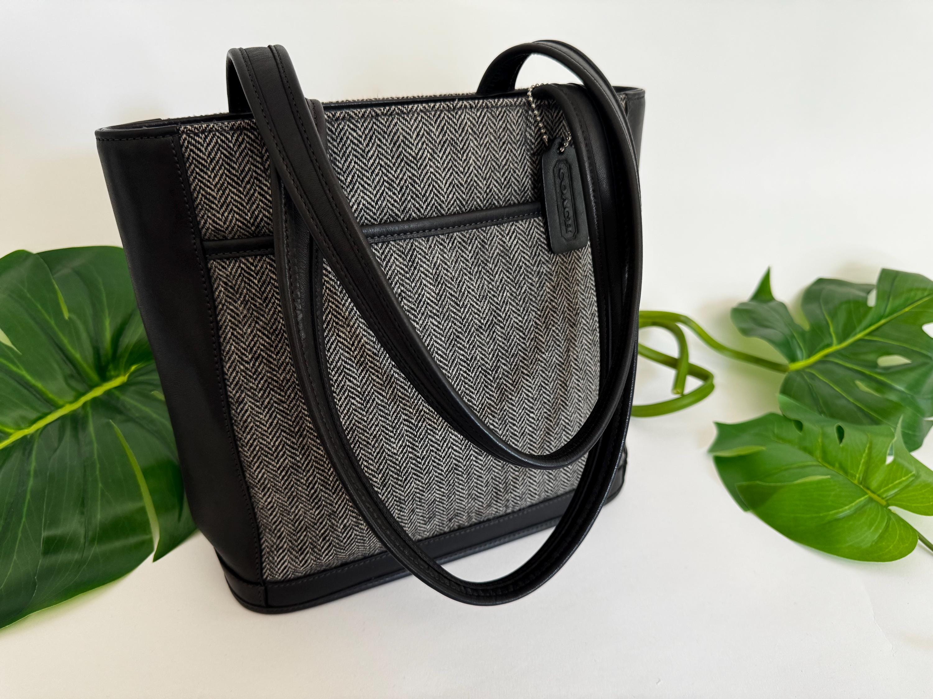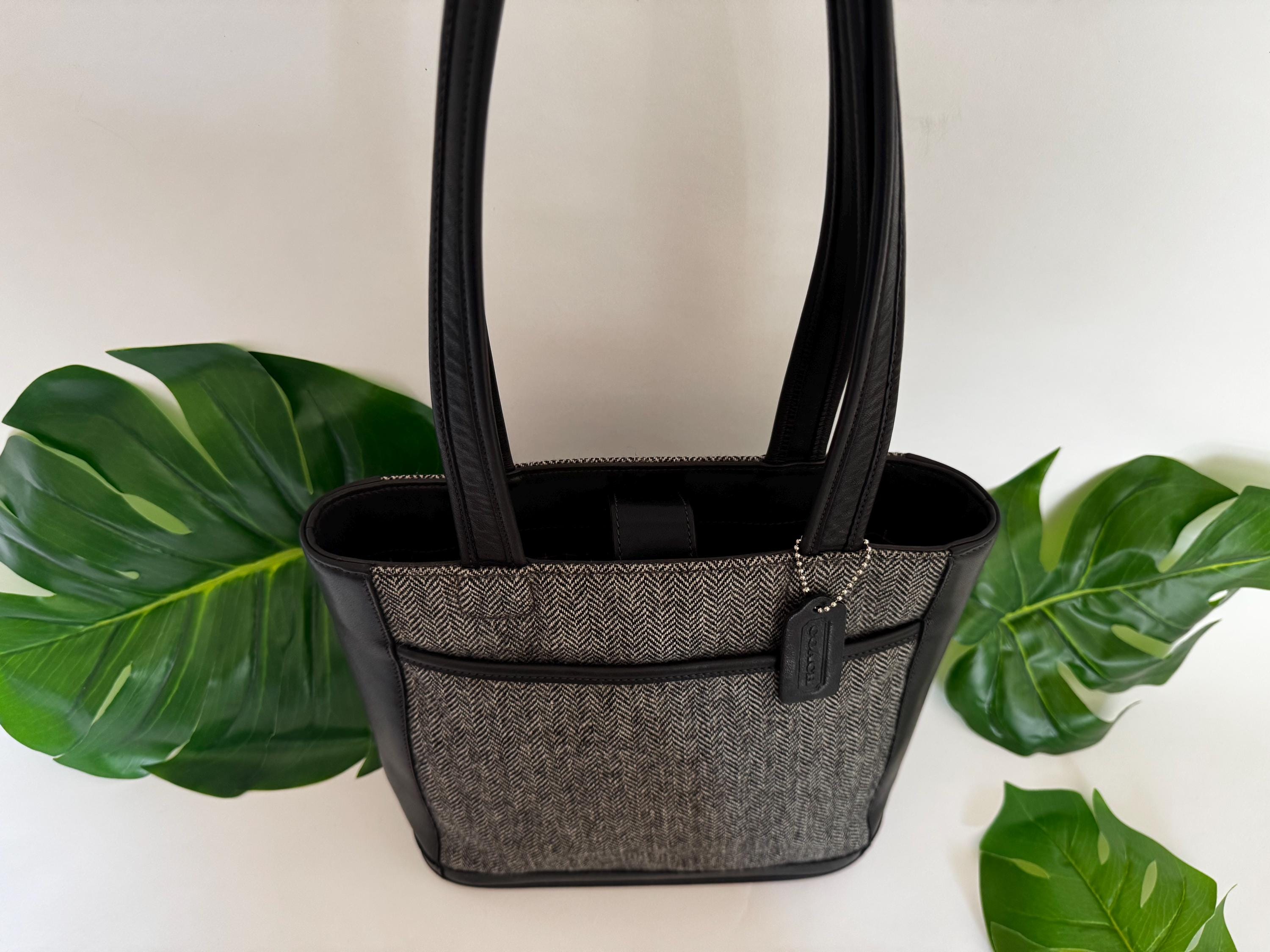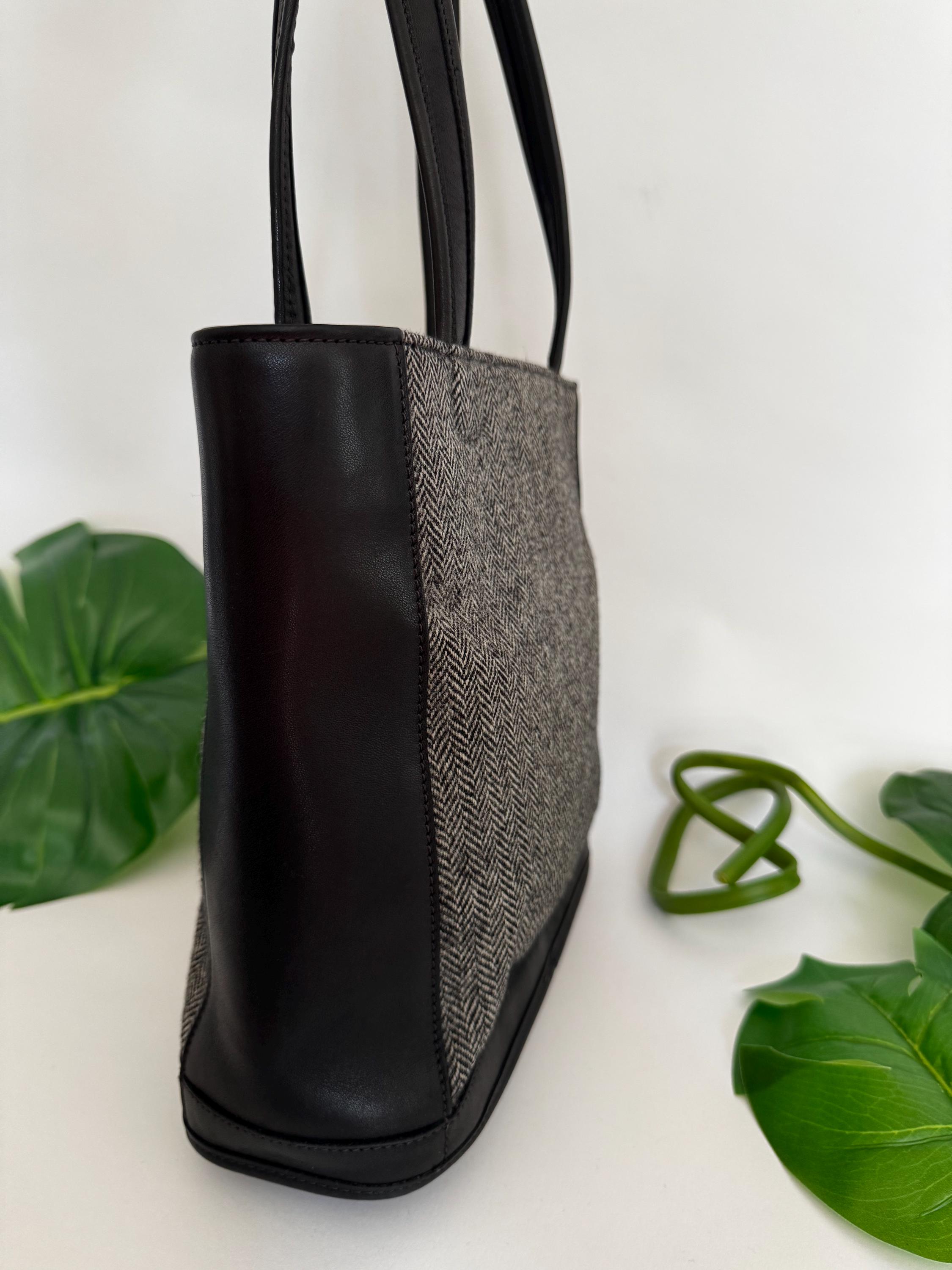 -One main compartment -Black and gray wool tweed in a herringbone pattern -Black leather trim and accents -Exterior slip pocket on the front -Interior leather tab and snap closure -Lined in a brown plaid fabric -Zipper pocket inside -Medium-sized non-structured bag -Leather Double handles -Non-removable strap with a 12 inch drop