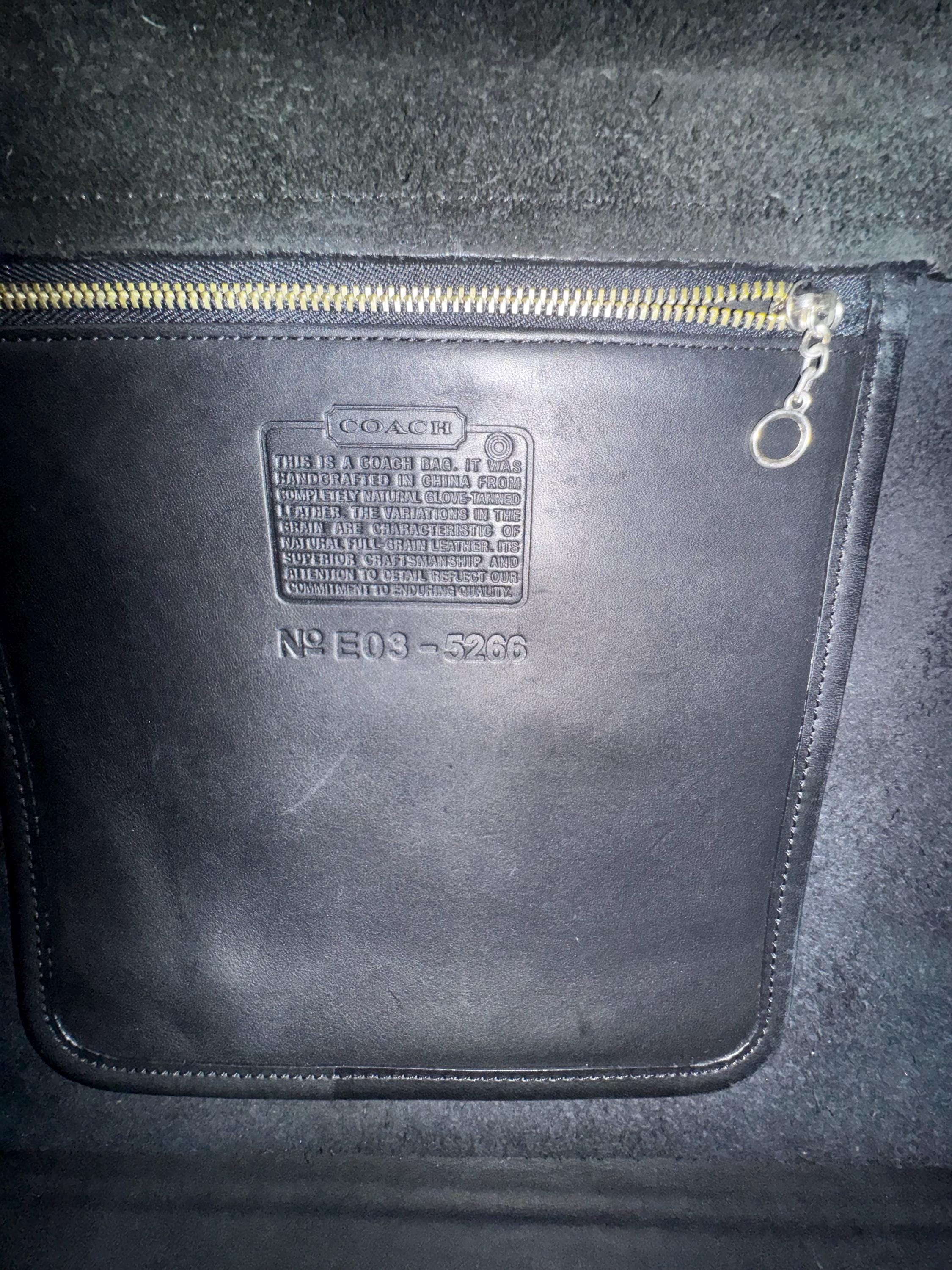 This Coach bag is made of thick, soft, and smooth leather with brass hardware. It is marked with an embossed creed and serial number, indicating that it was made in China
