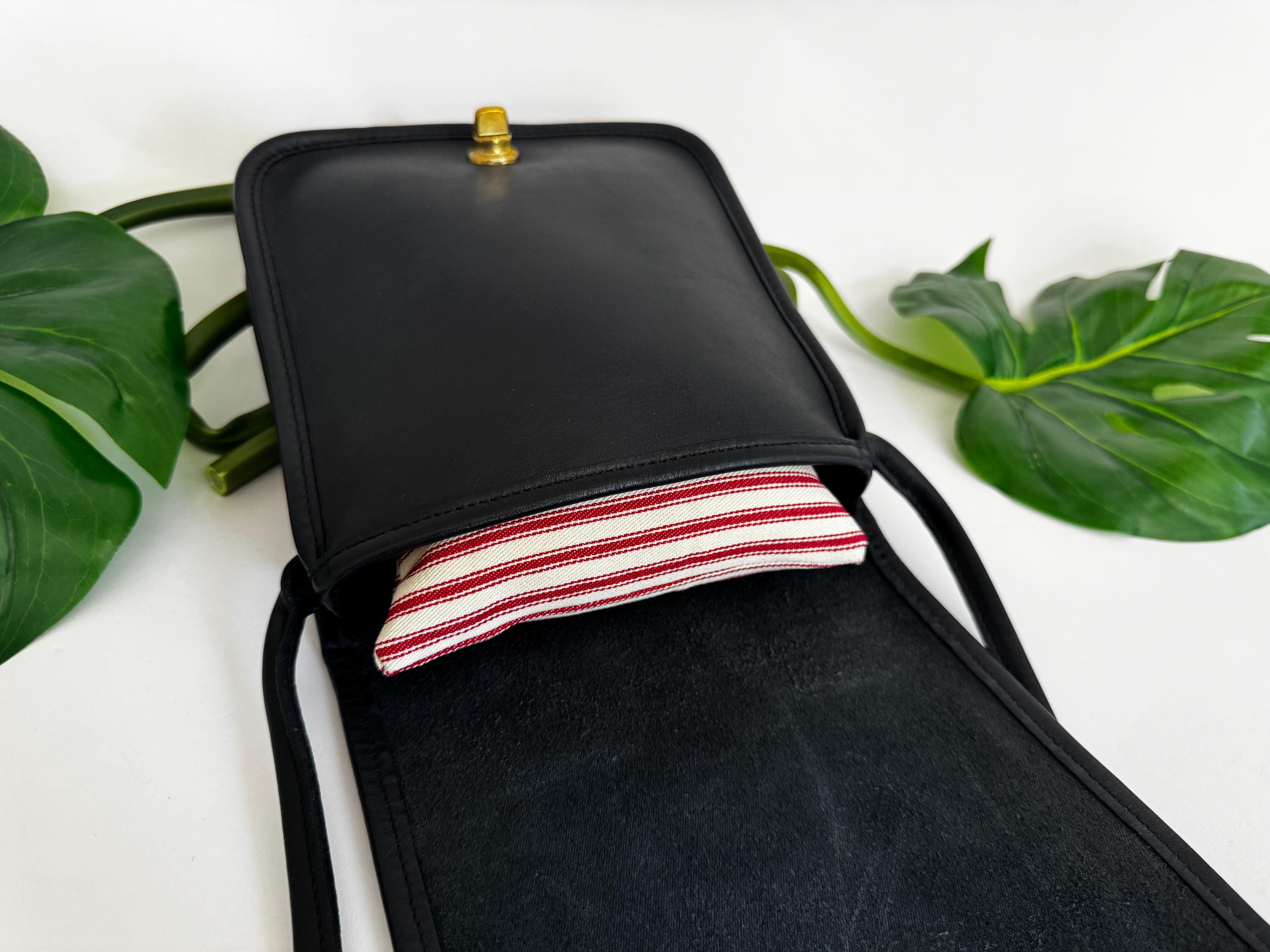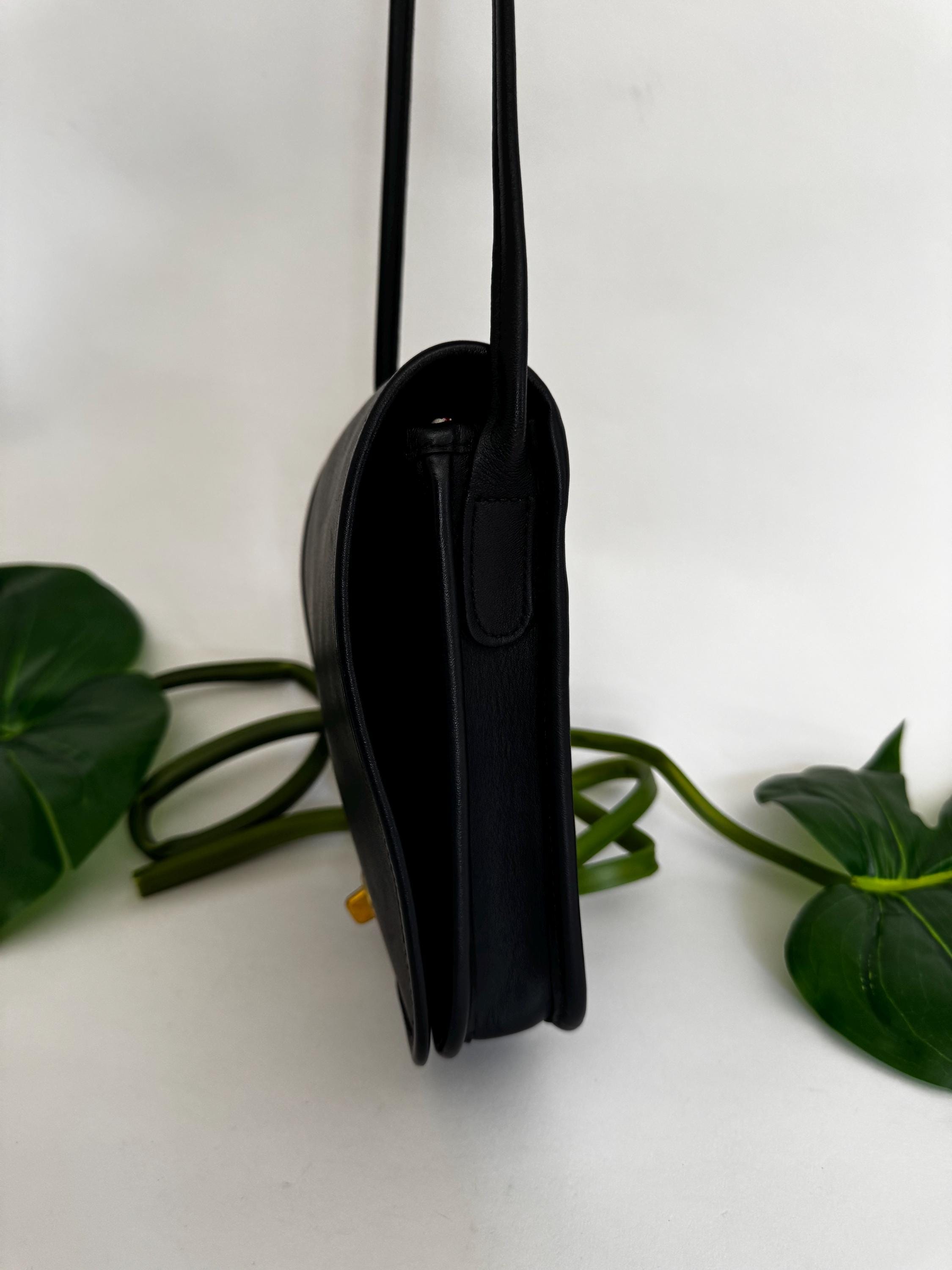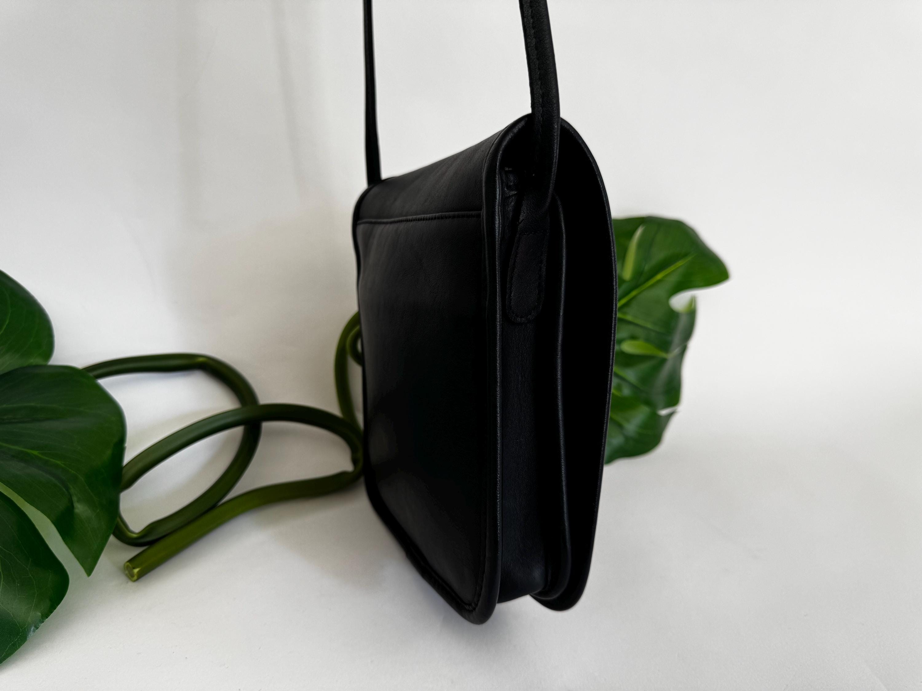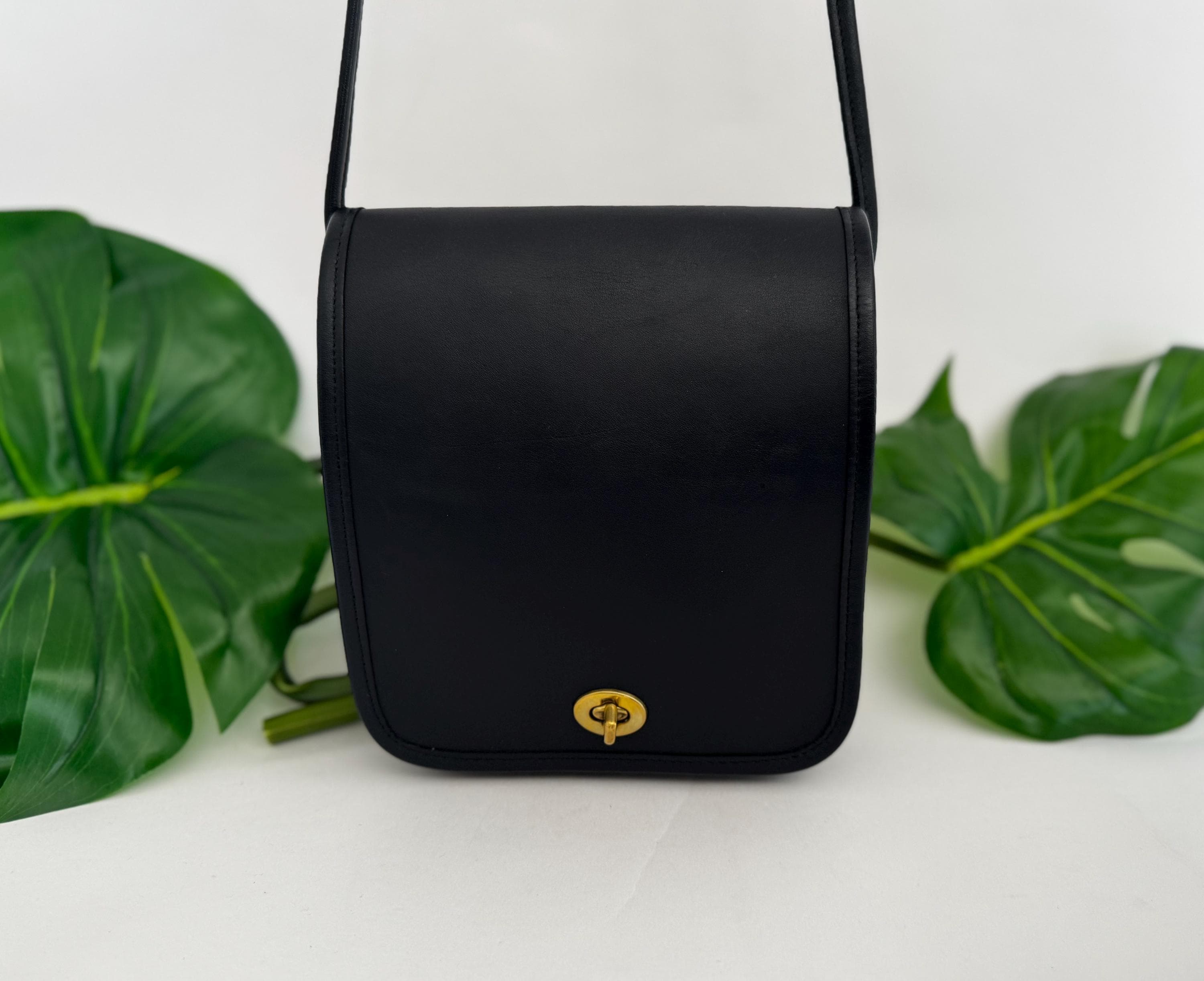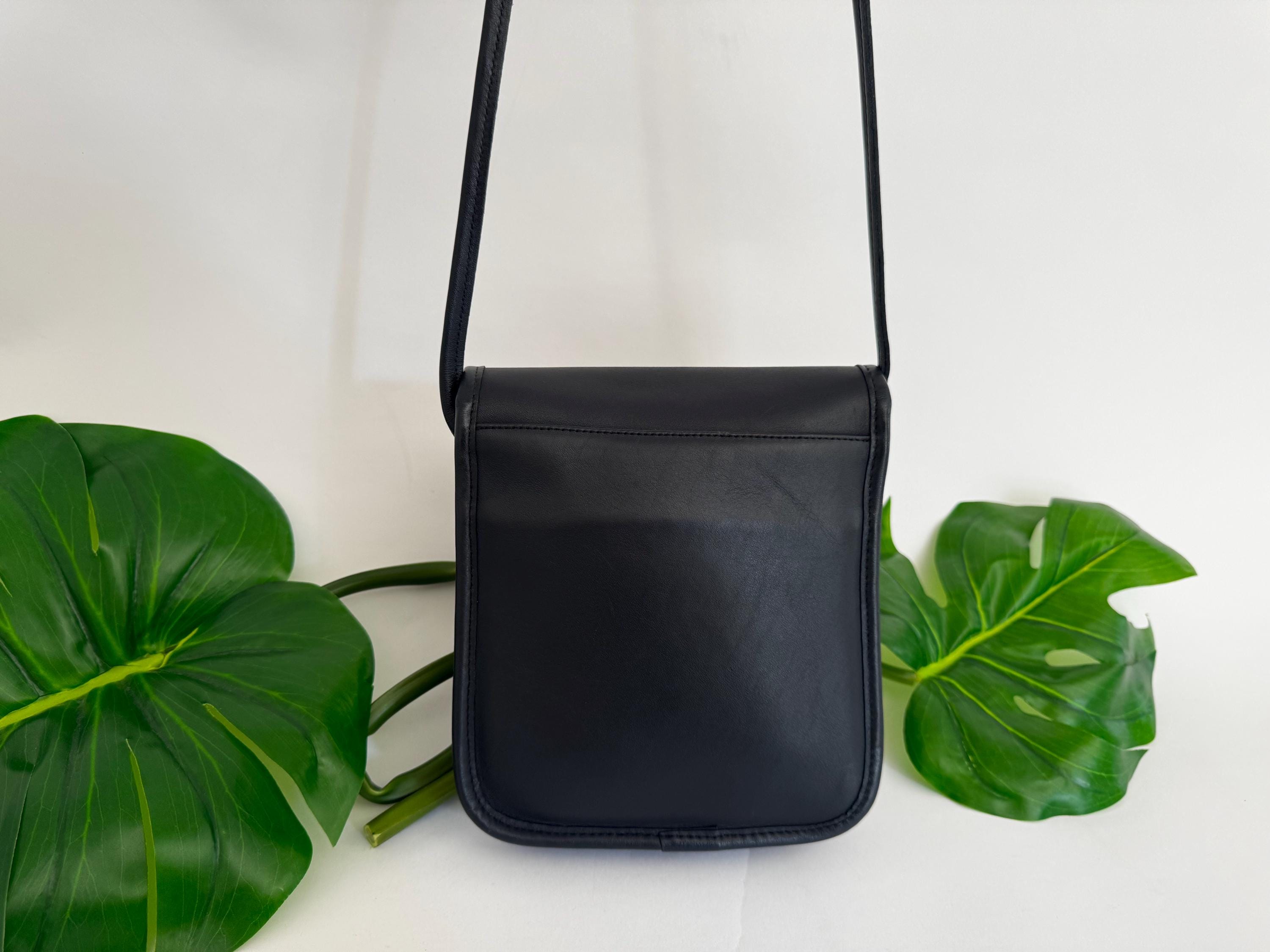 Features: -Flap closure with brass turnkey -Lightweight & versatile -Interior slip pocket -Shoulder strap, 22” drop -Cleaned, leather conditioned, brass polished & ready to use!