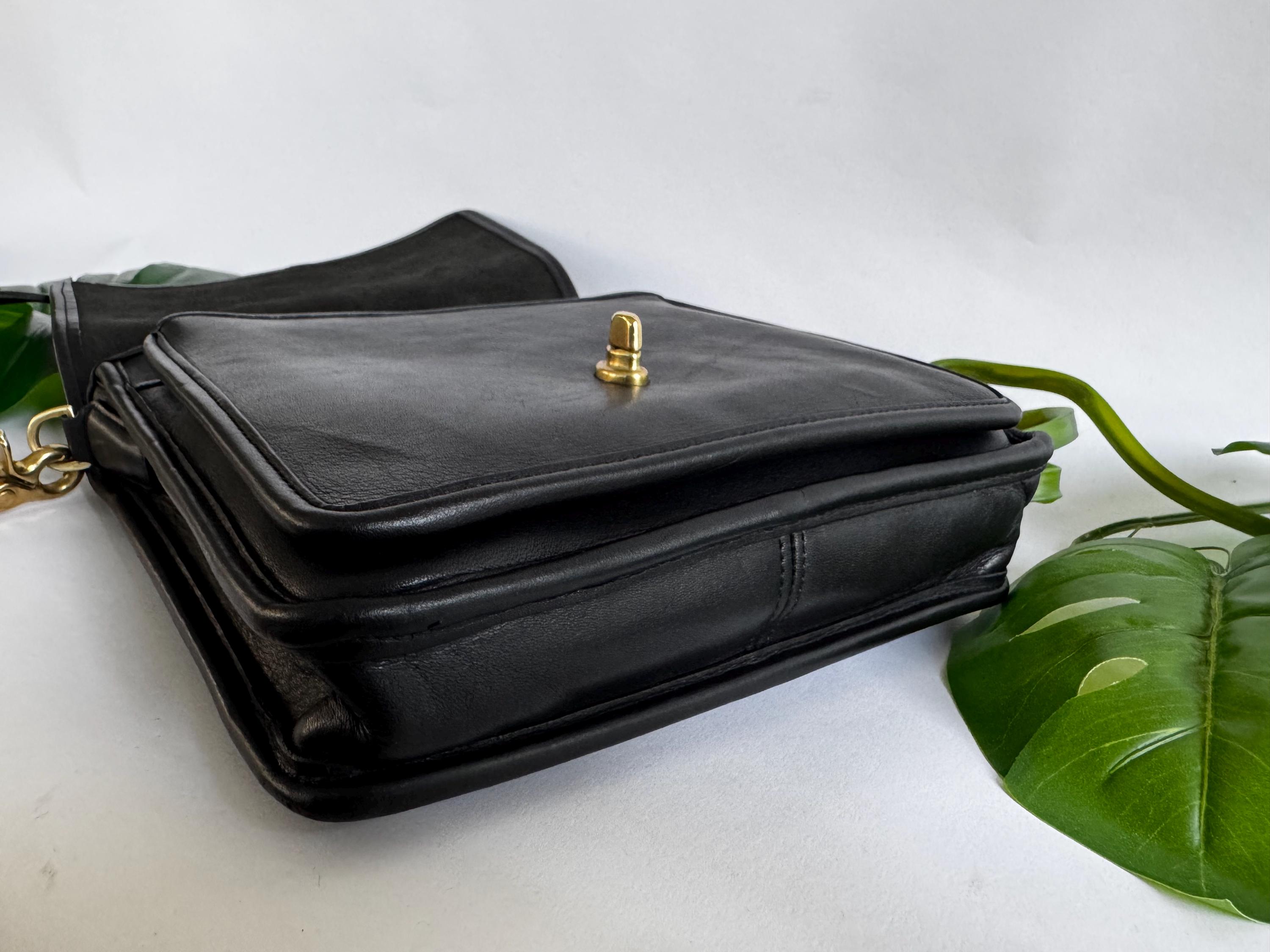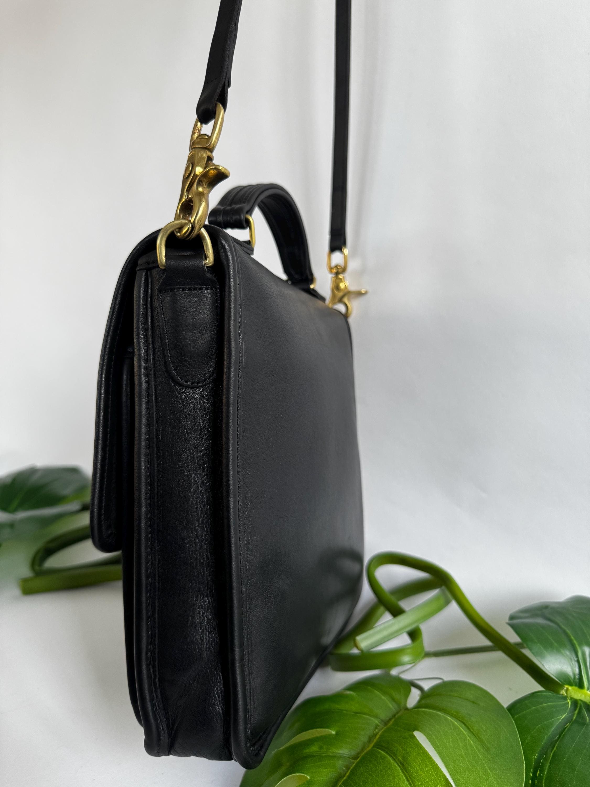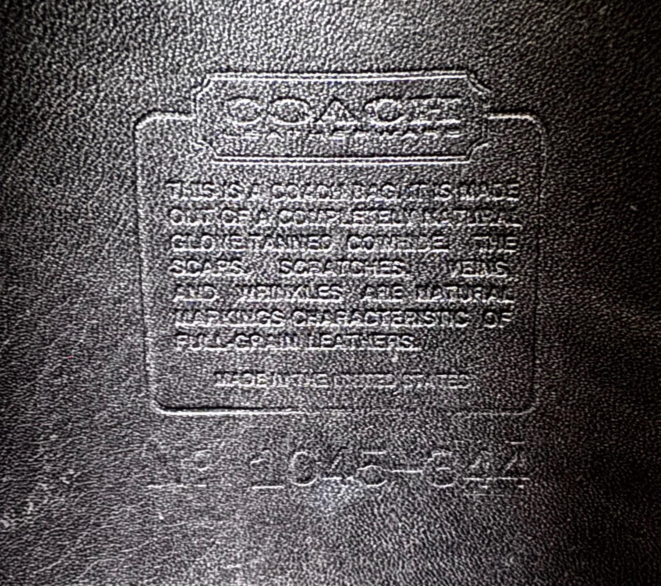This Coach bag has thick, soft, and smooth leather with brass hardware. It is marked with an embossed creed and serial number indicating this bag was made in the United States