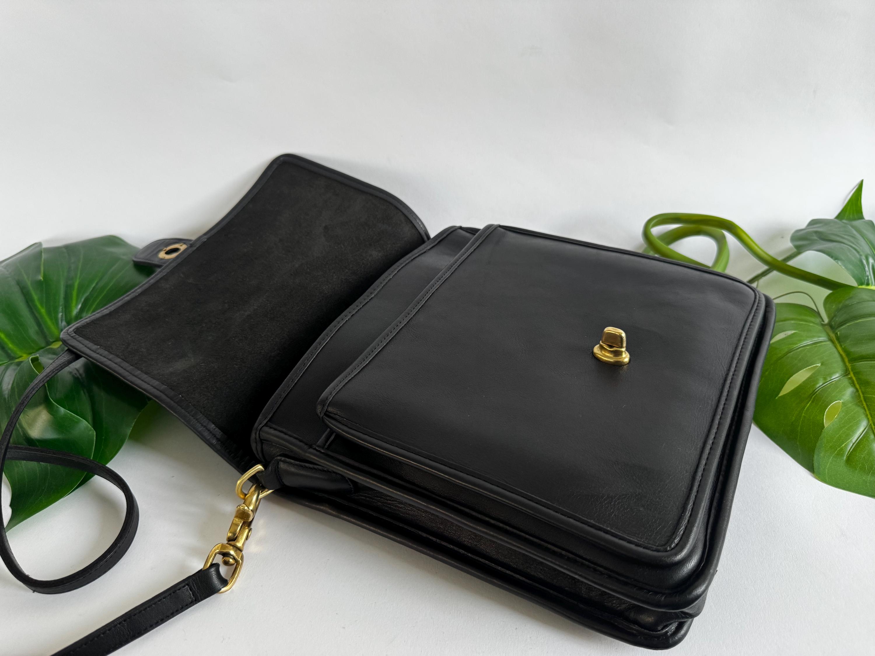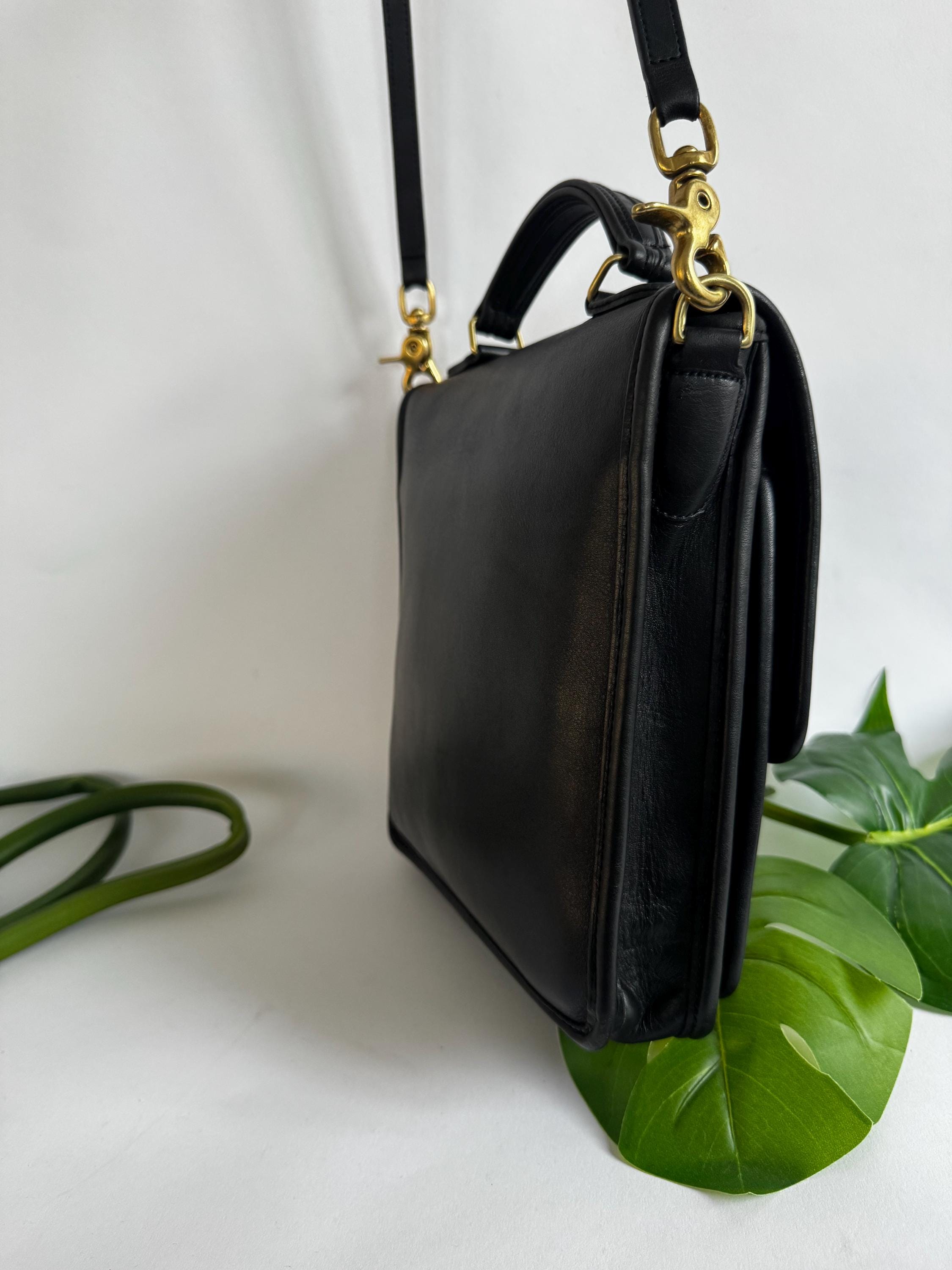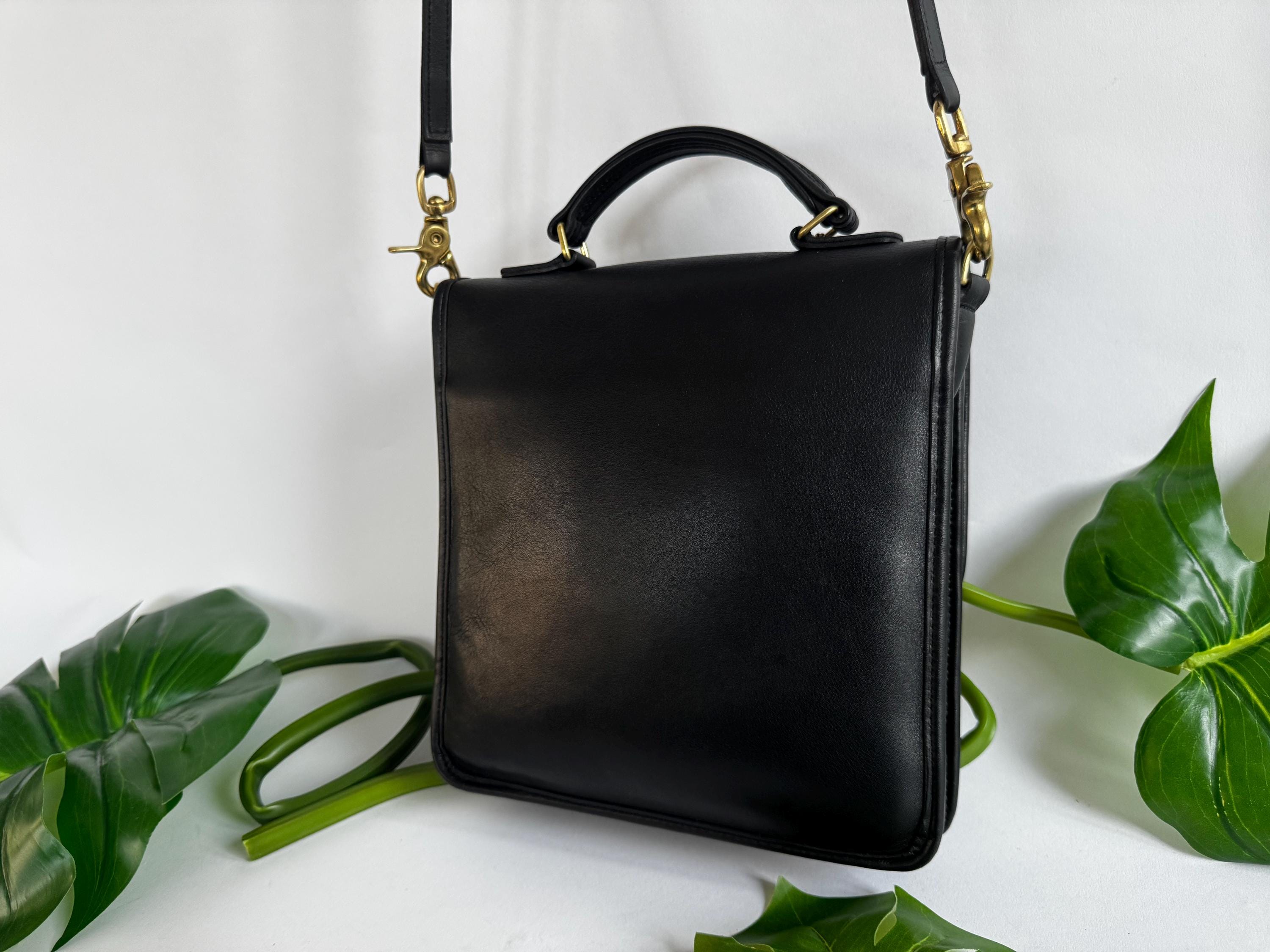 This Coach bag has thick, soft, and smooth leather with brass hardware. It is marked with an embossed creed and serial number indicating this bag was made in the United States