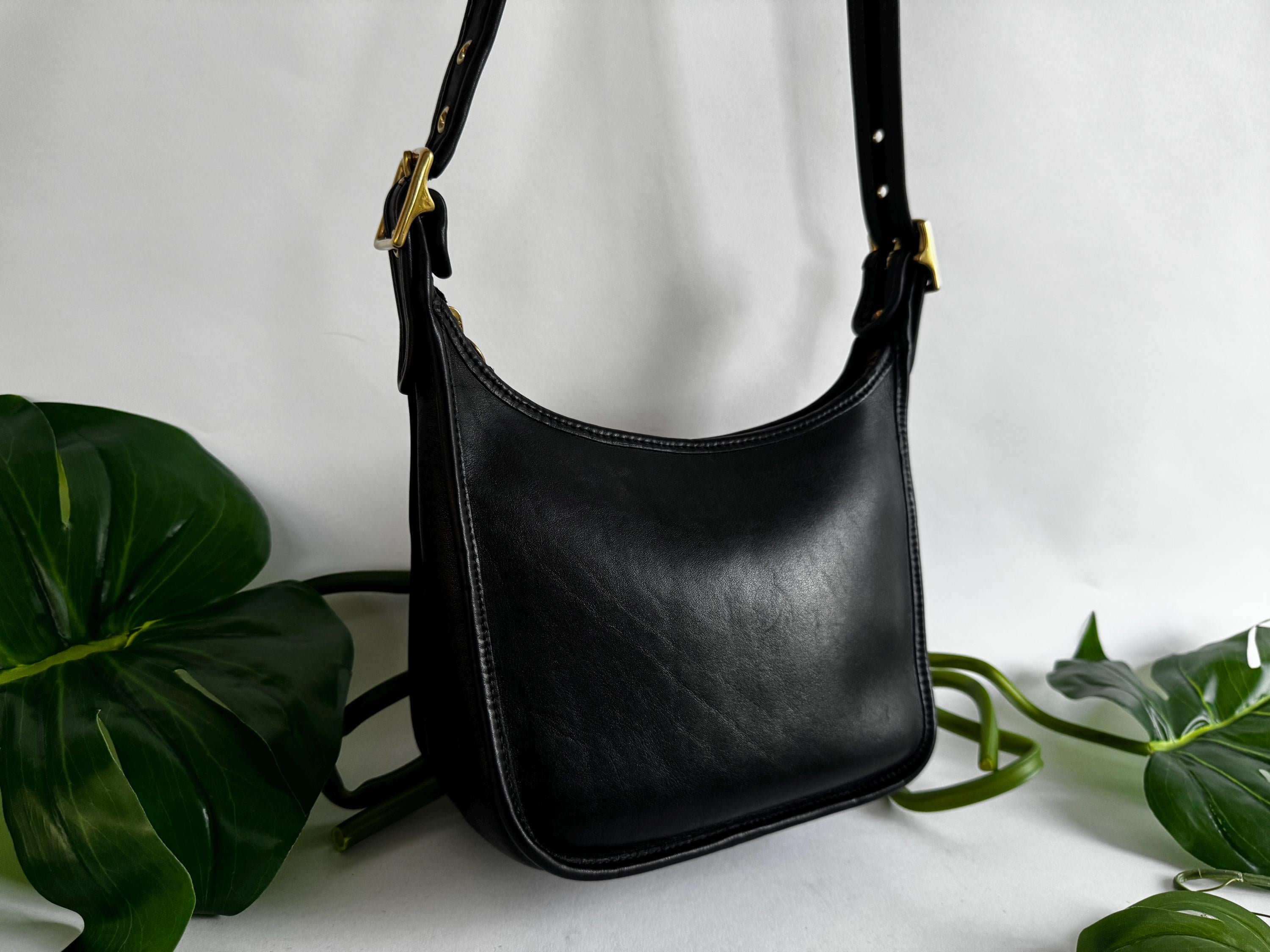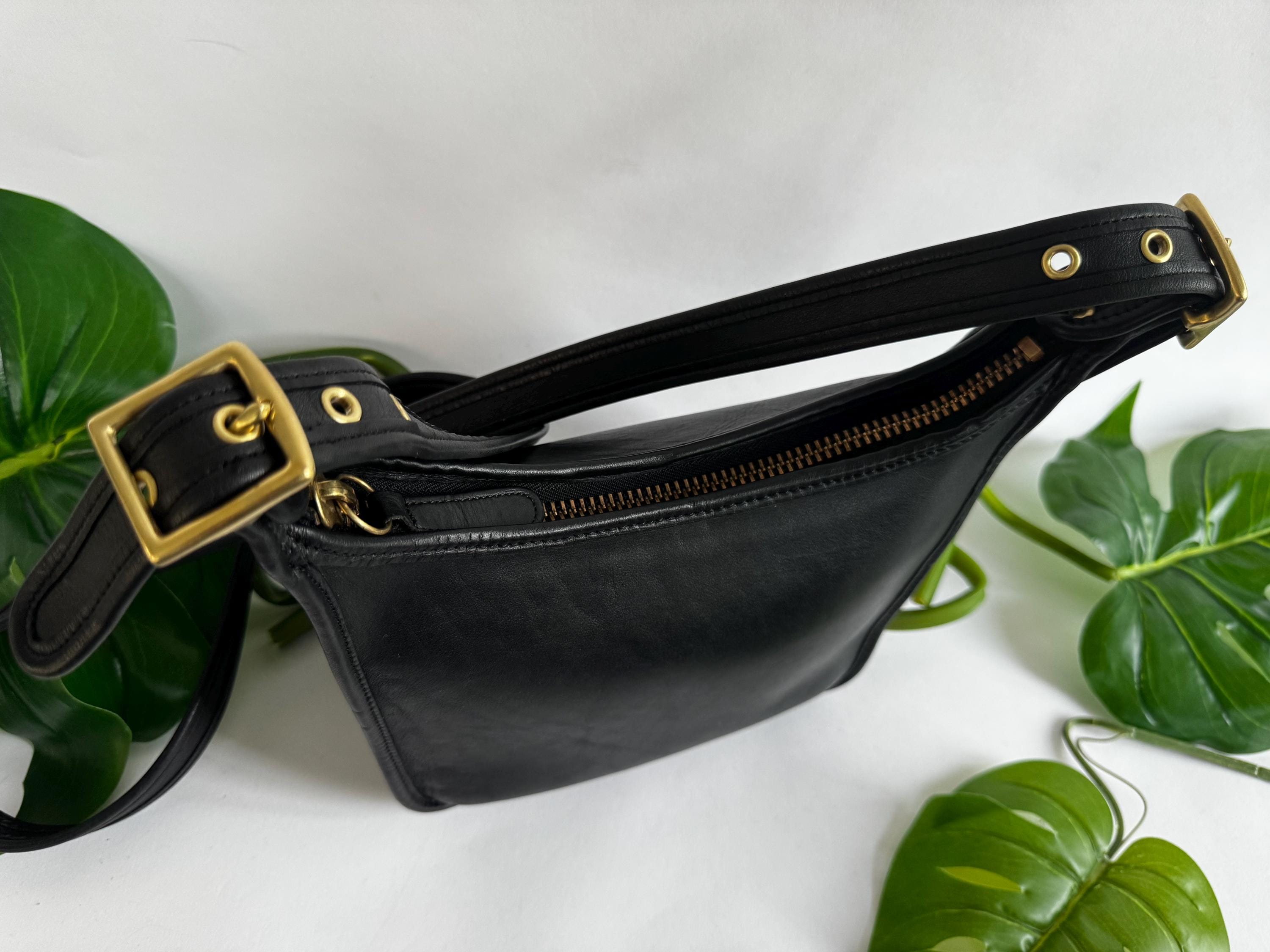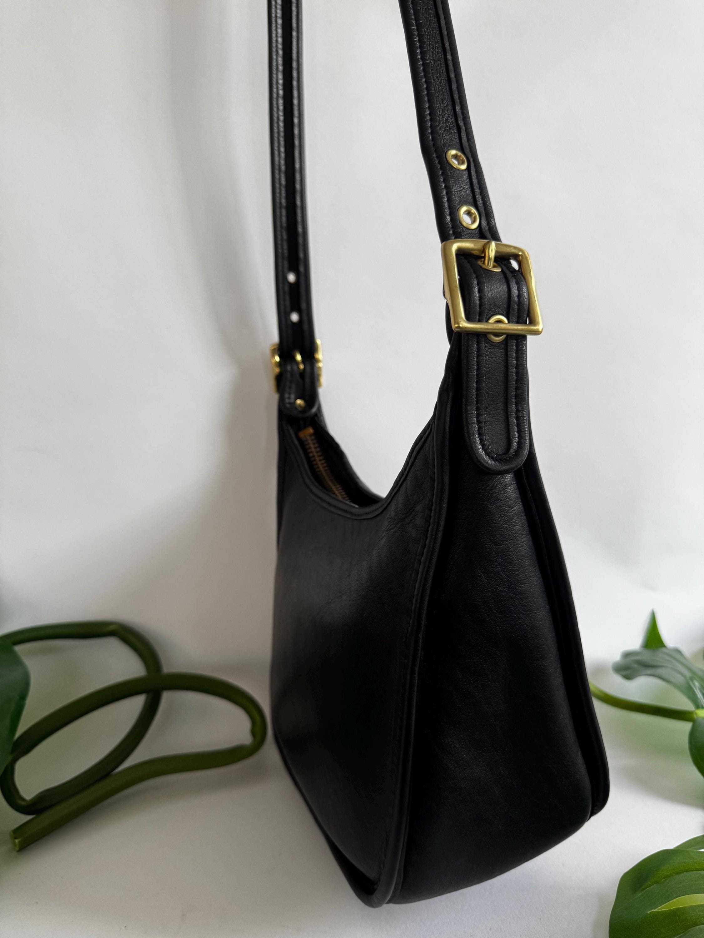 Features: Iconic industrial brass zipper Zip closure Interior pocket Exterior slip pocket Adjustable strap, 22“ drop Cleaned, conditioned & ready to use!