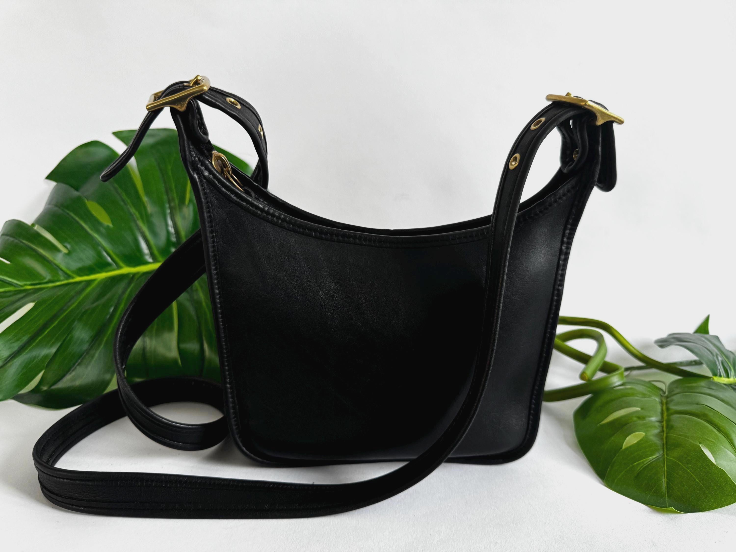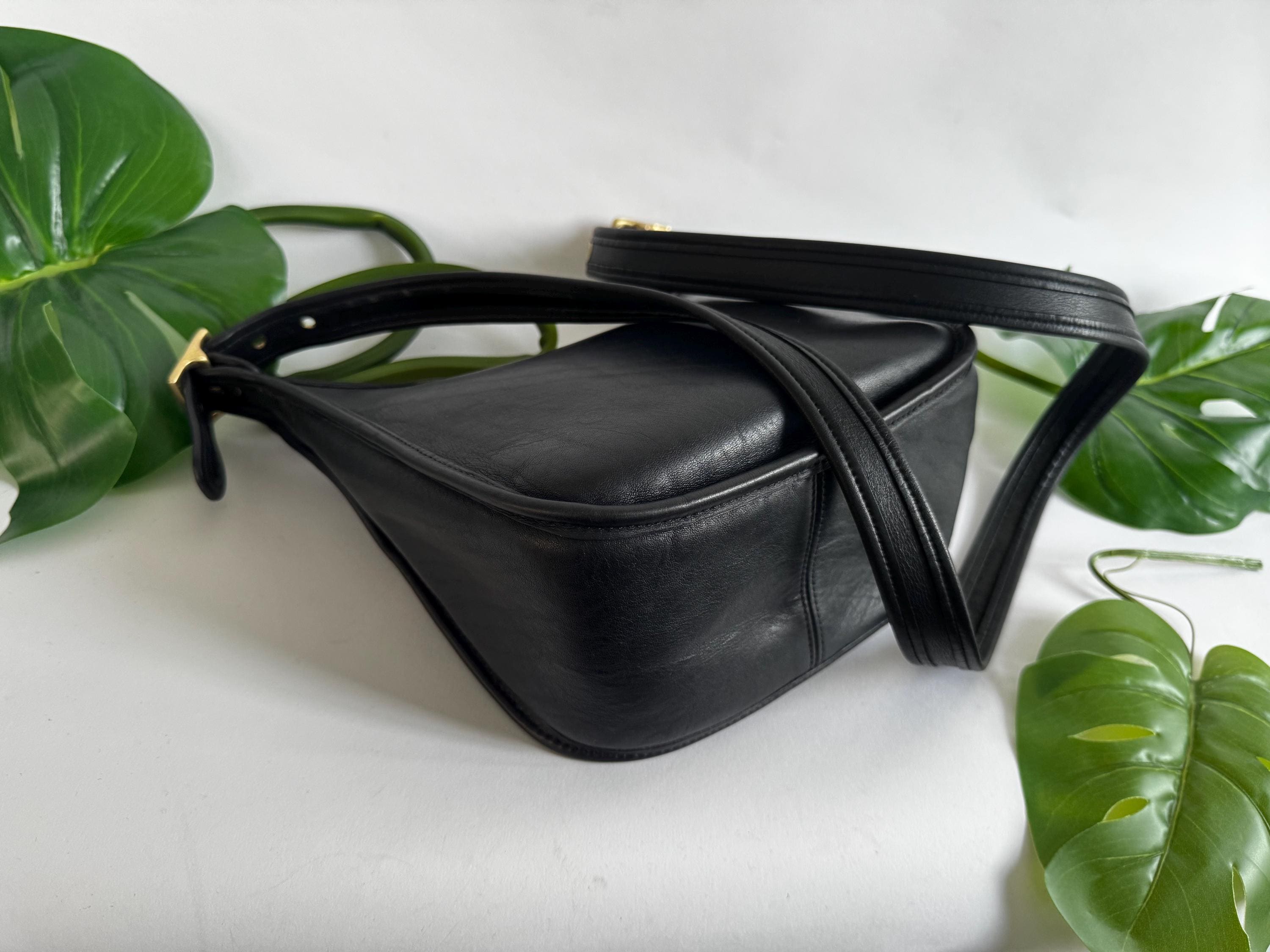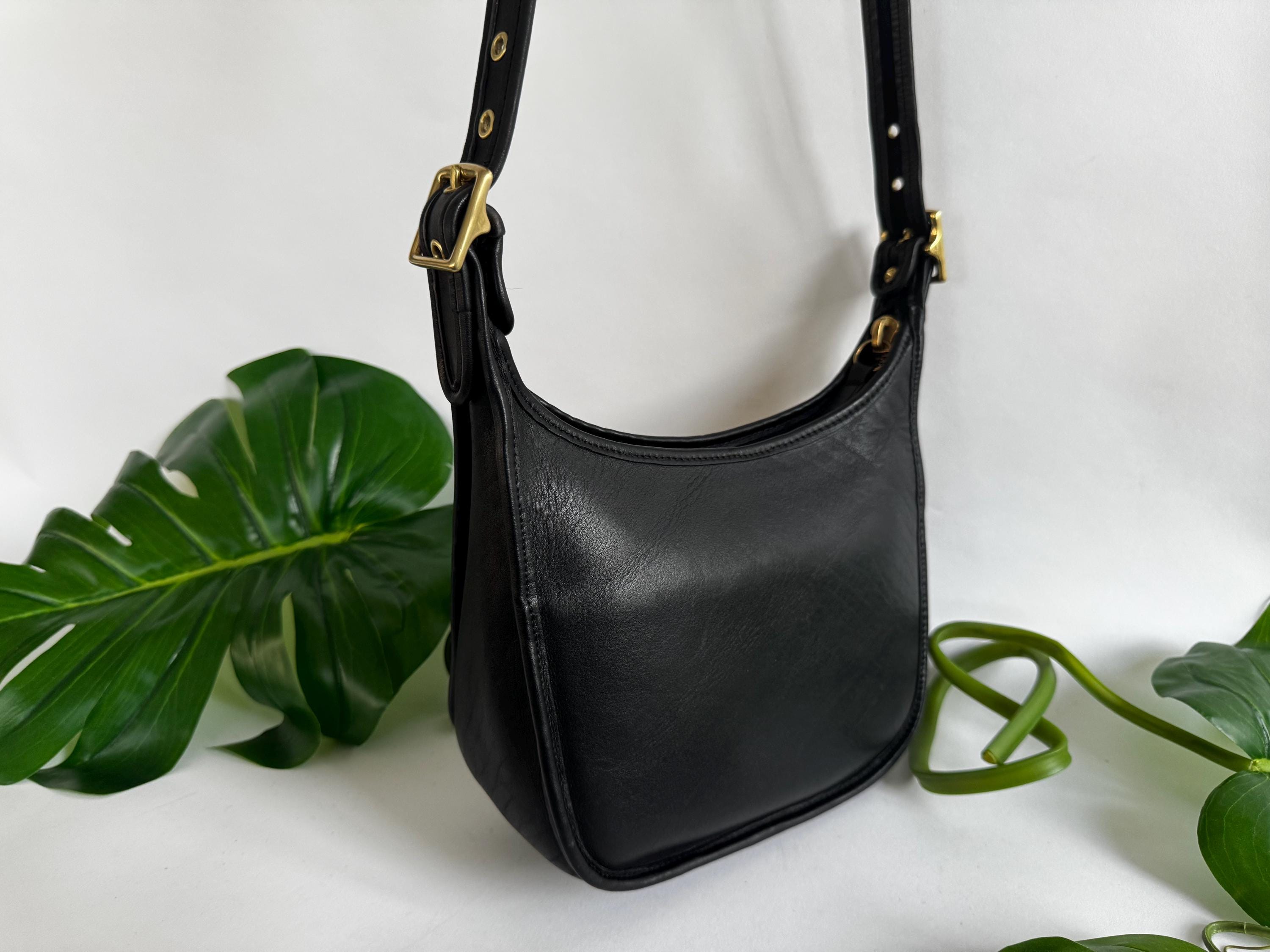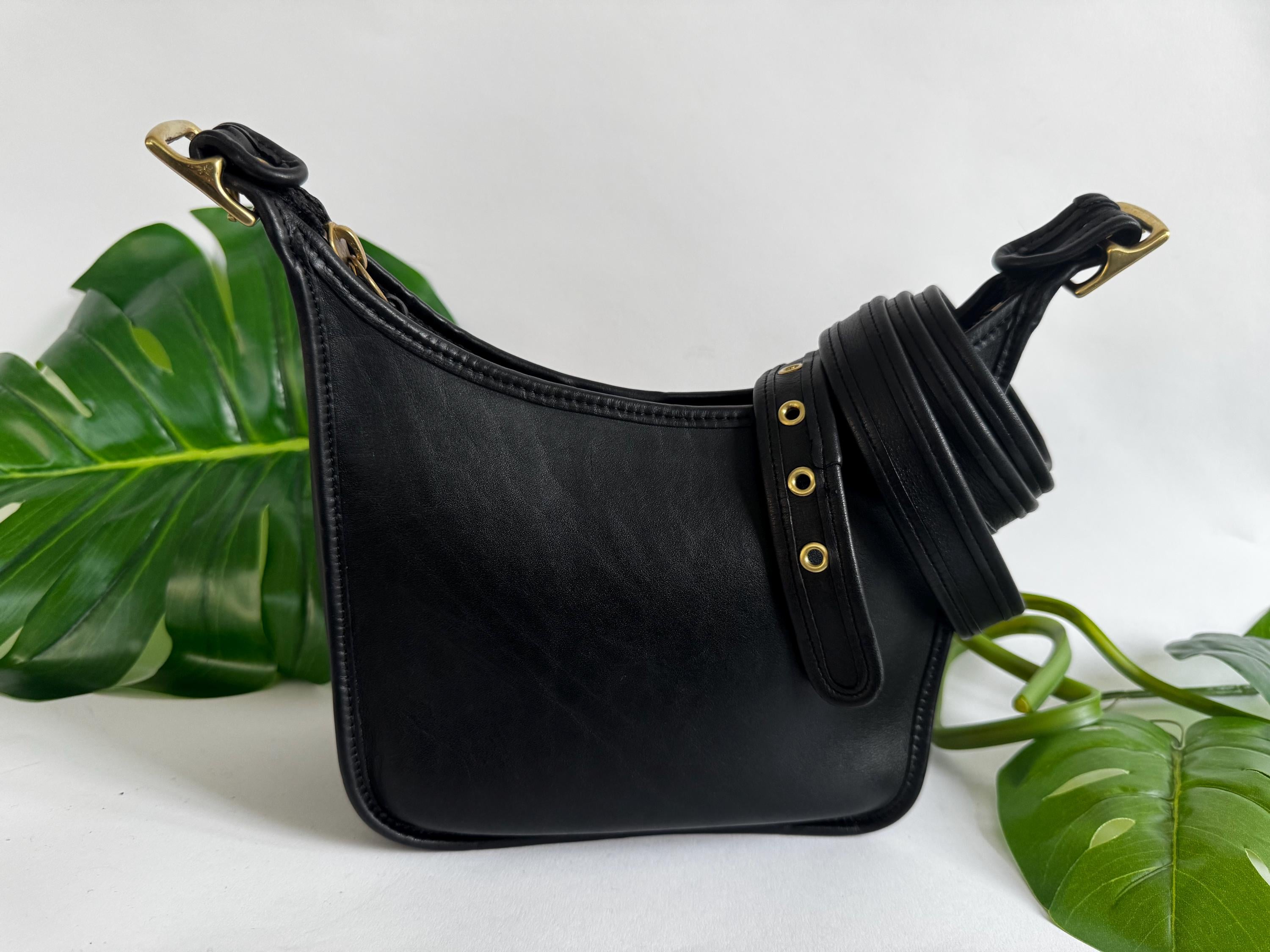 Features: Iconic industrial brass zipper Zip closure Interior pocket Exterior slip pocket Adjustable strap, 22“ drop Cleaned, conditioned & ready to use!
