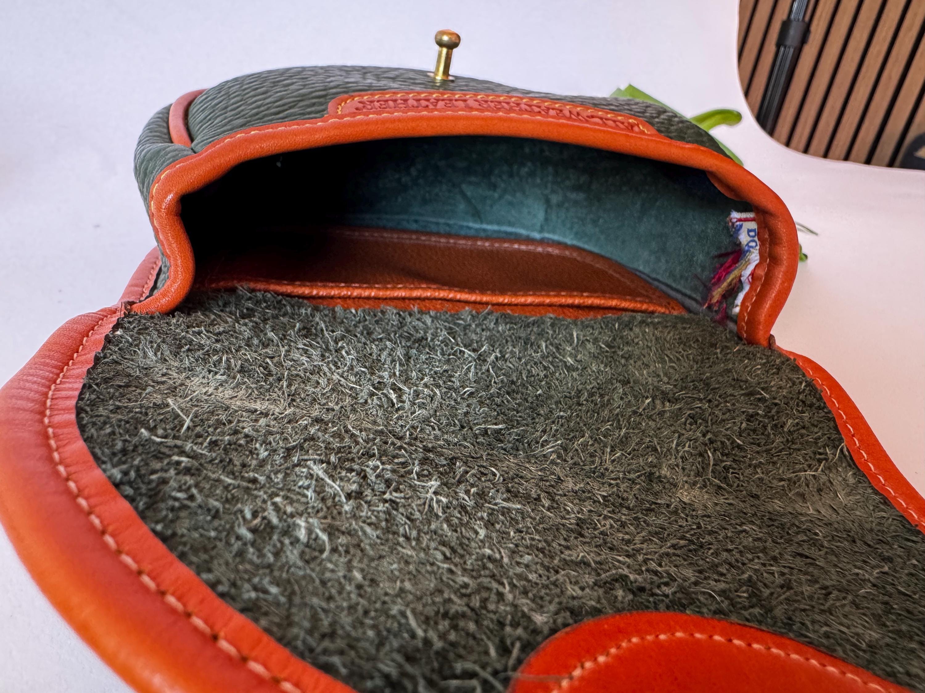 Features: -Can be worn as a crossbody bag, on a belt with belt loops on the back, or used as a detached wallet. -Flap Closure with brass turnlock -Interior slip pocket -Removable shoulder strap, 26" drop, detachable, not adjustable -Cleaned, Conditioned & ready to use
