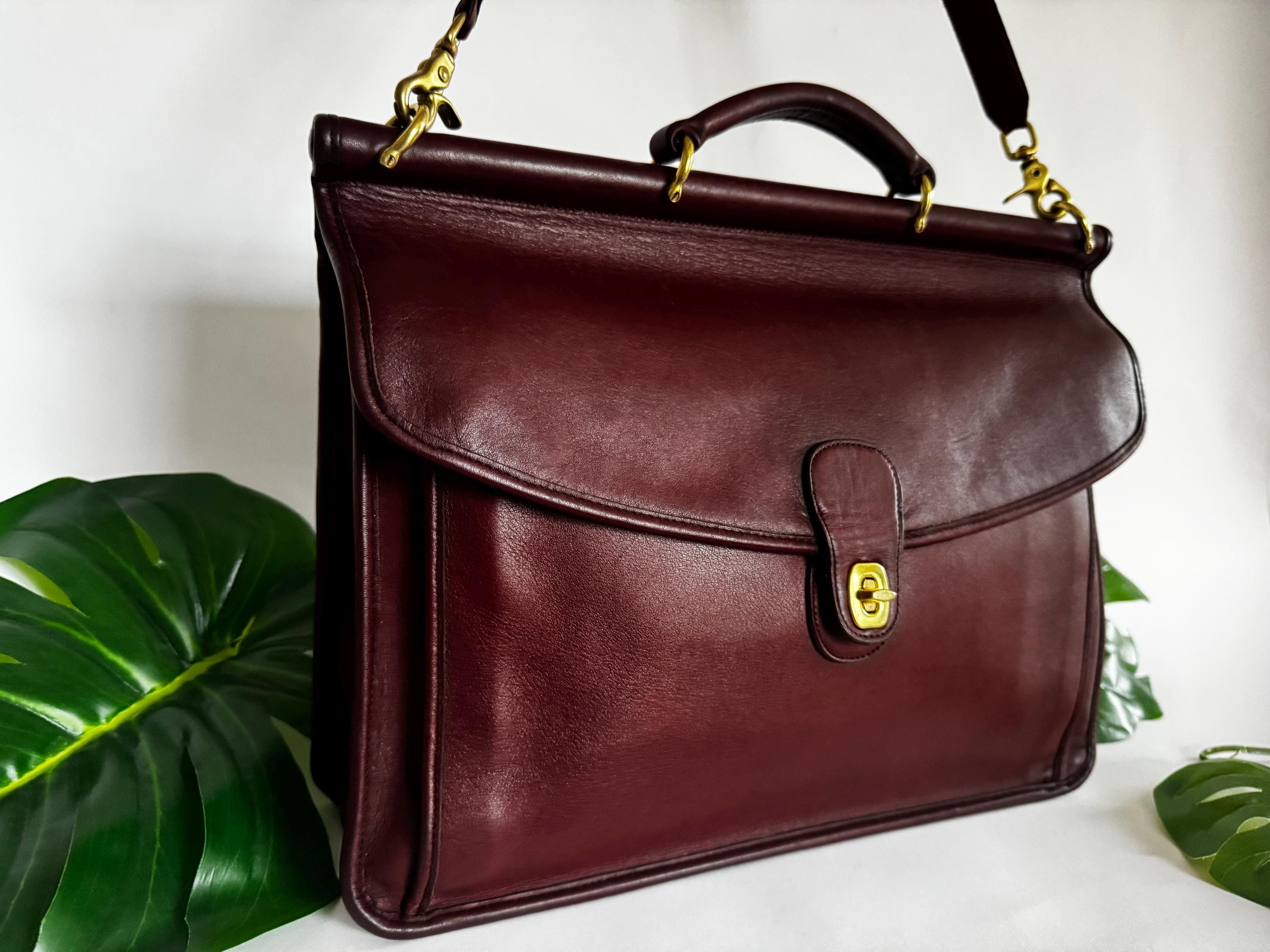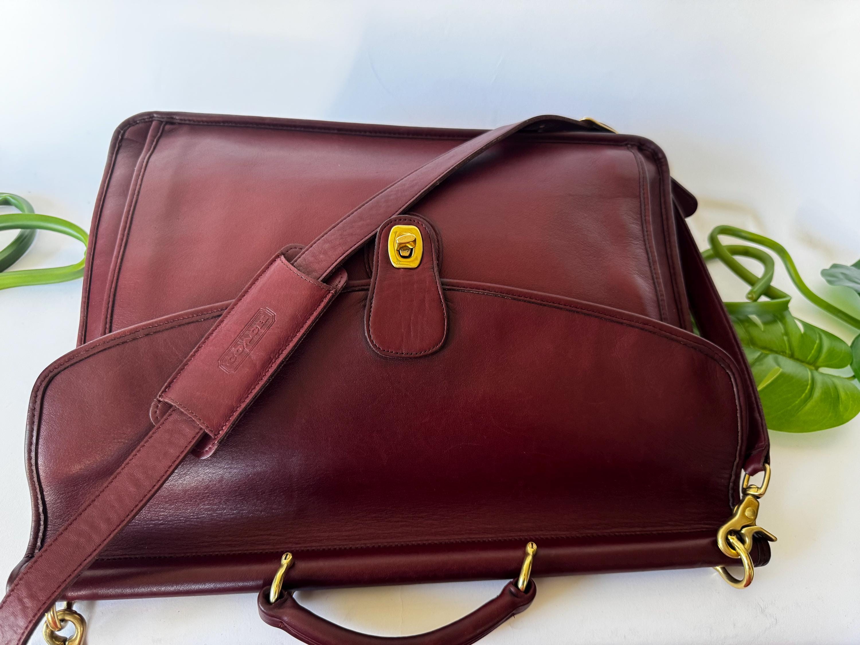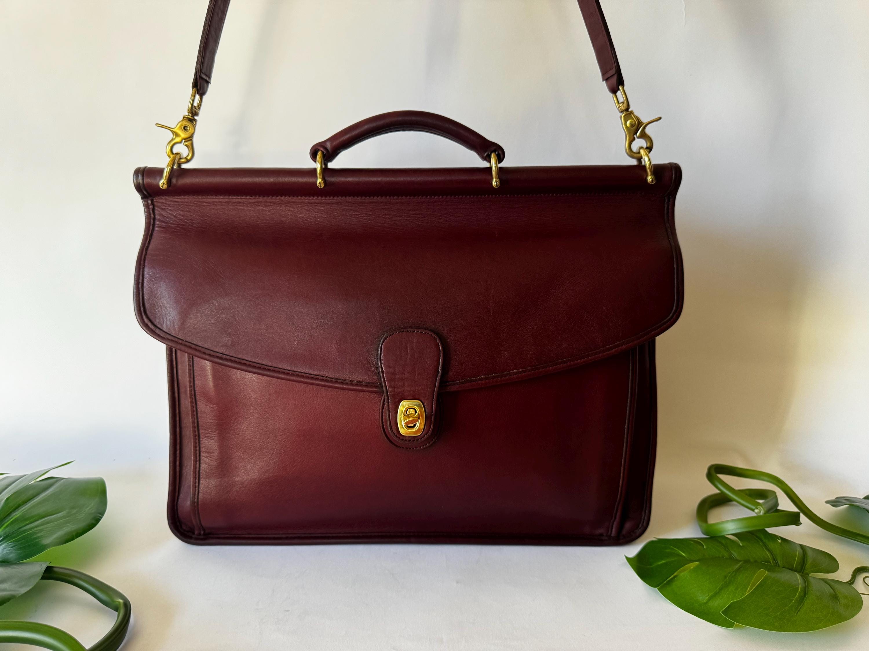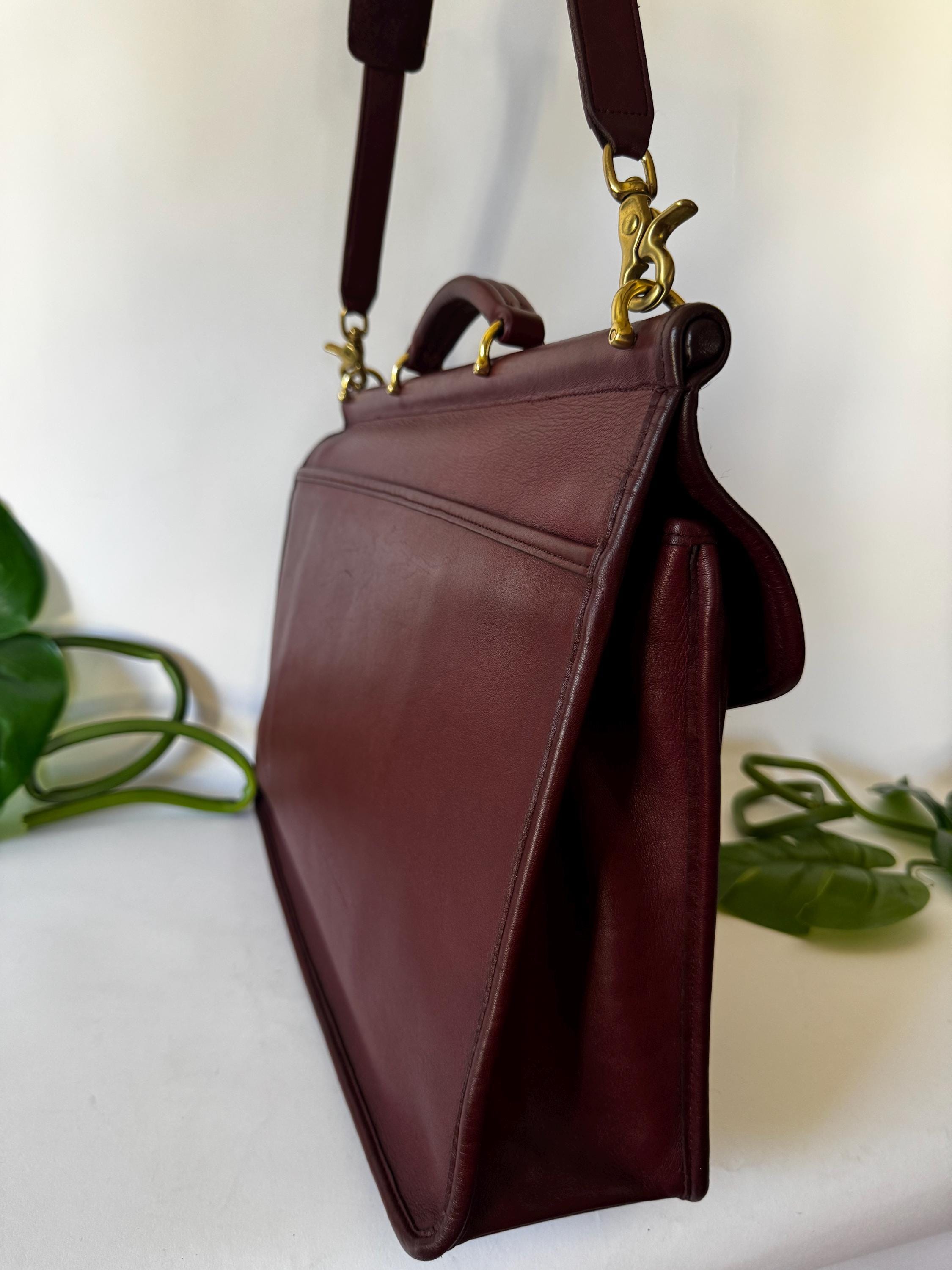 Features: Adjustable shoulder strap Brasst urn closure Brass lobster clasps strap Top Handle Exterior back pocket is perfect for files & paperwork Two Interior compartments Interior slip pocket Memo pad pocket, card pocket & pen holder Great for a laptop