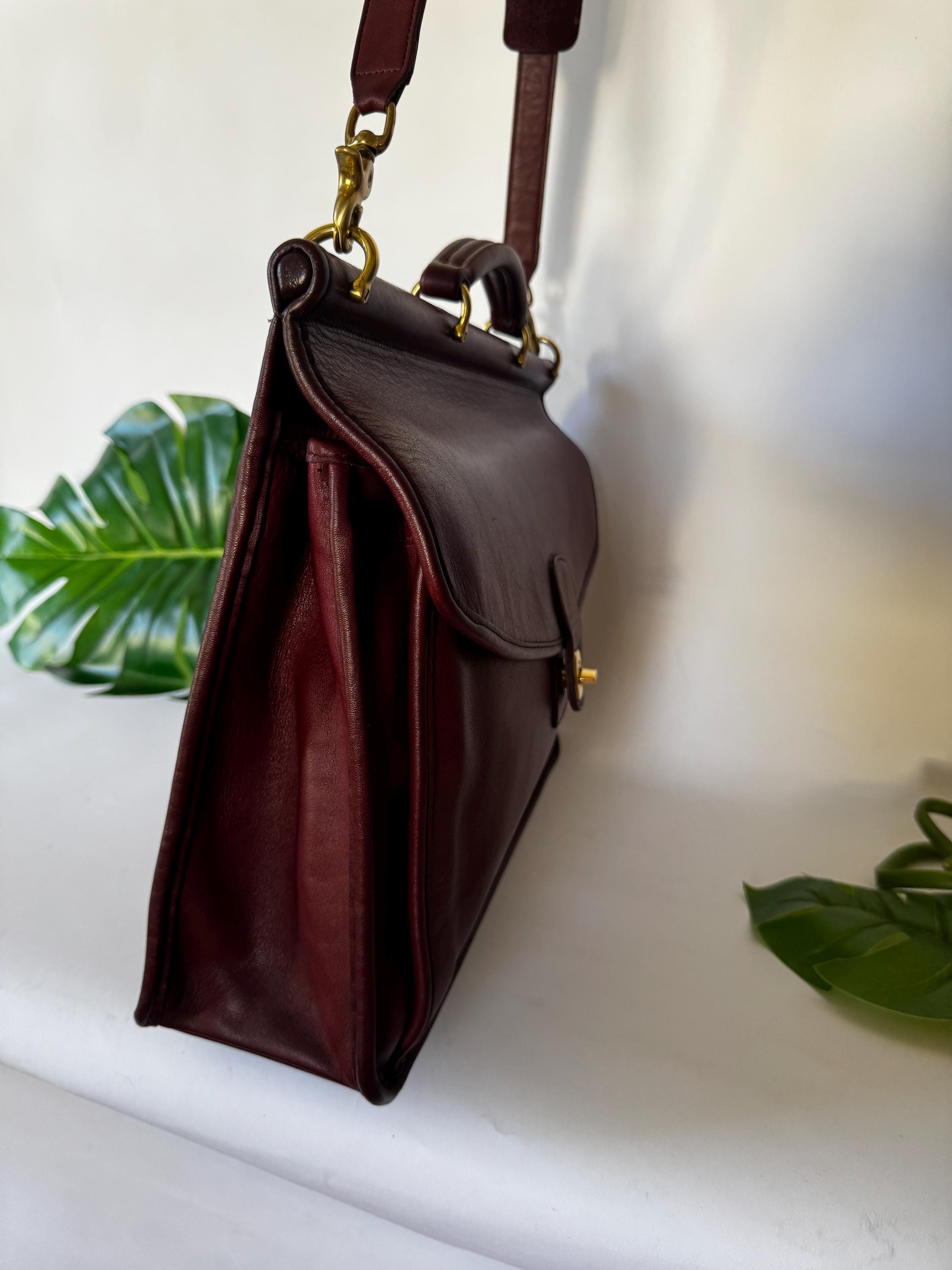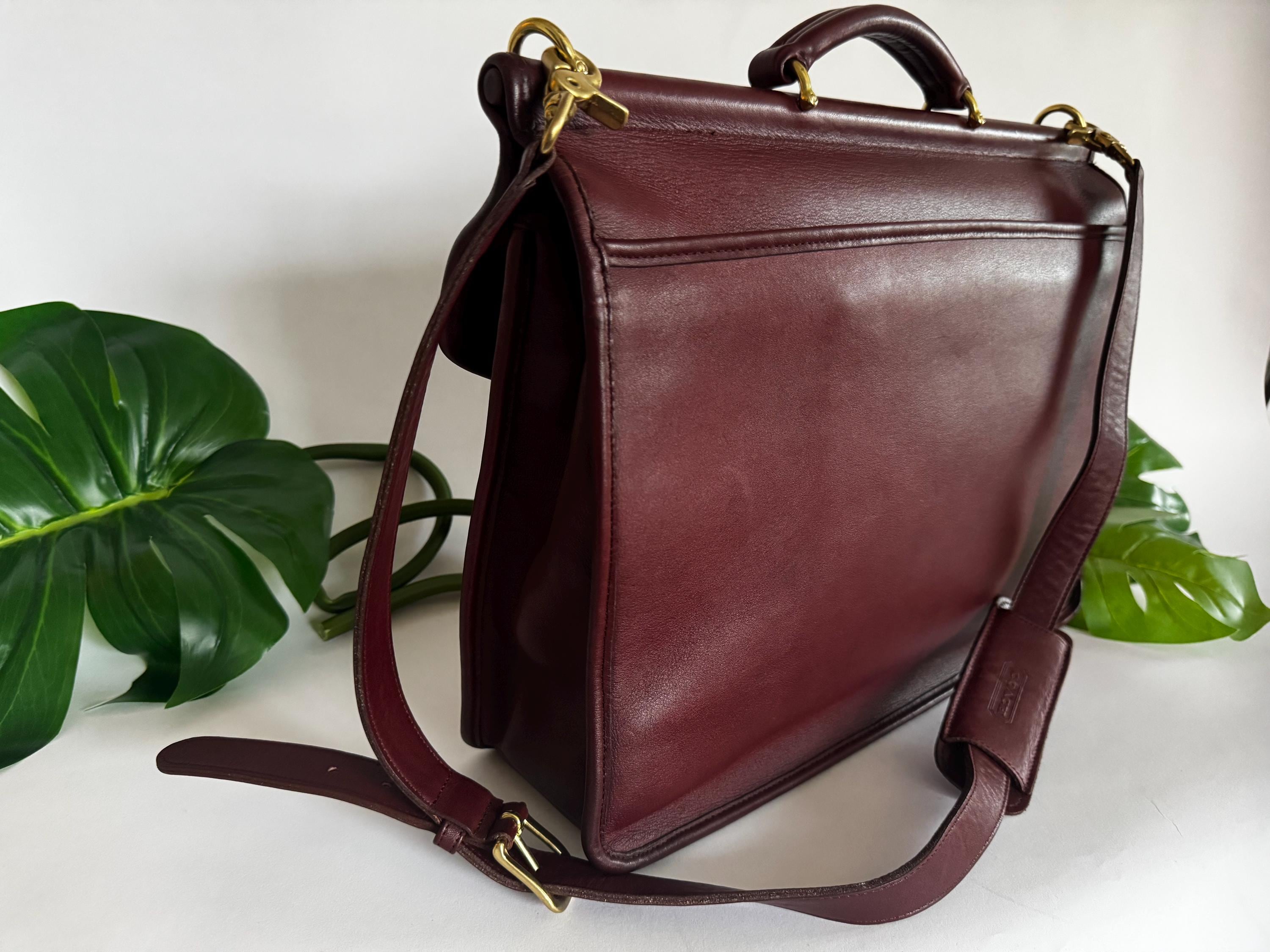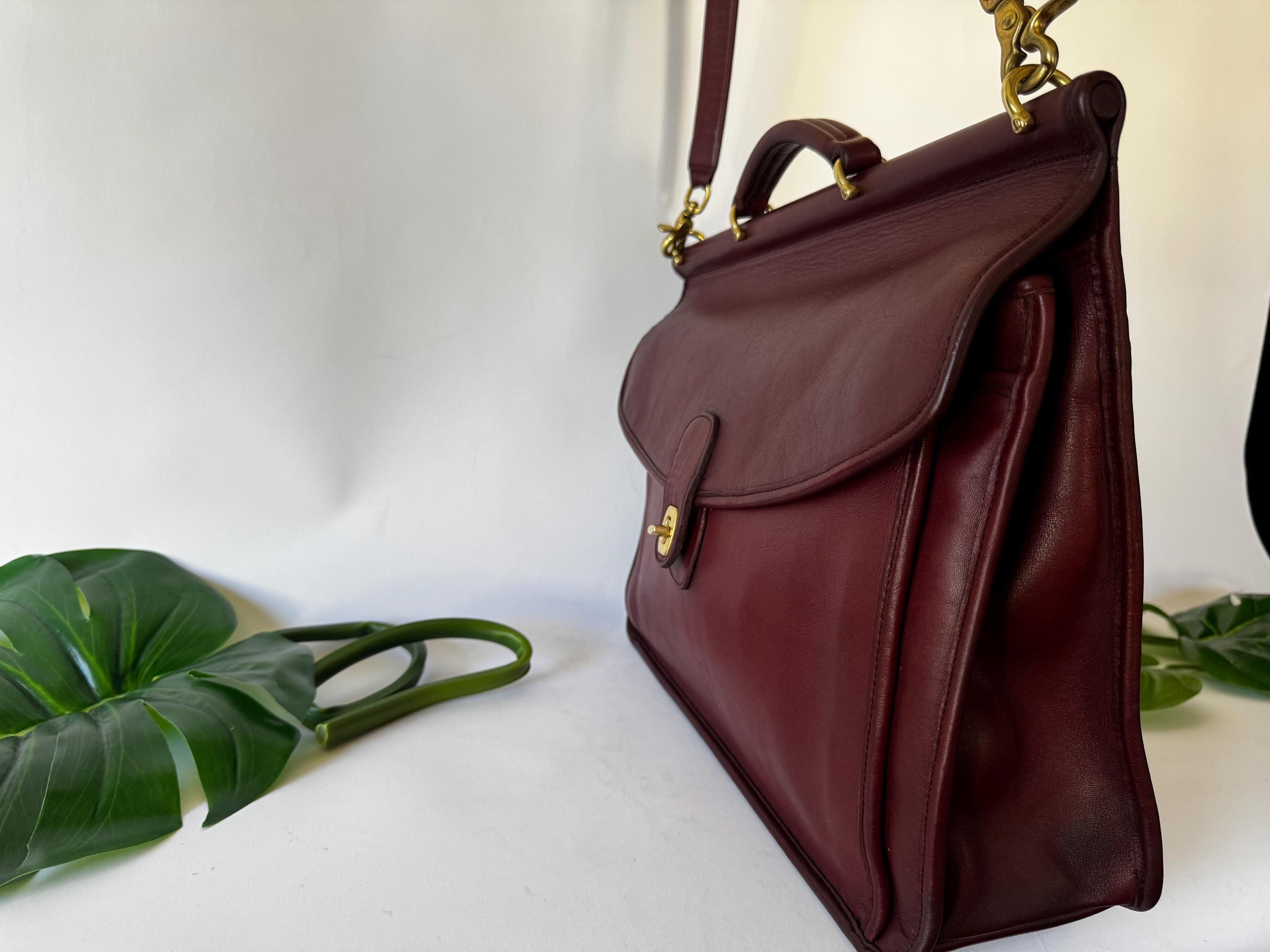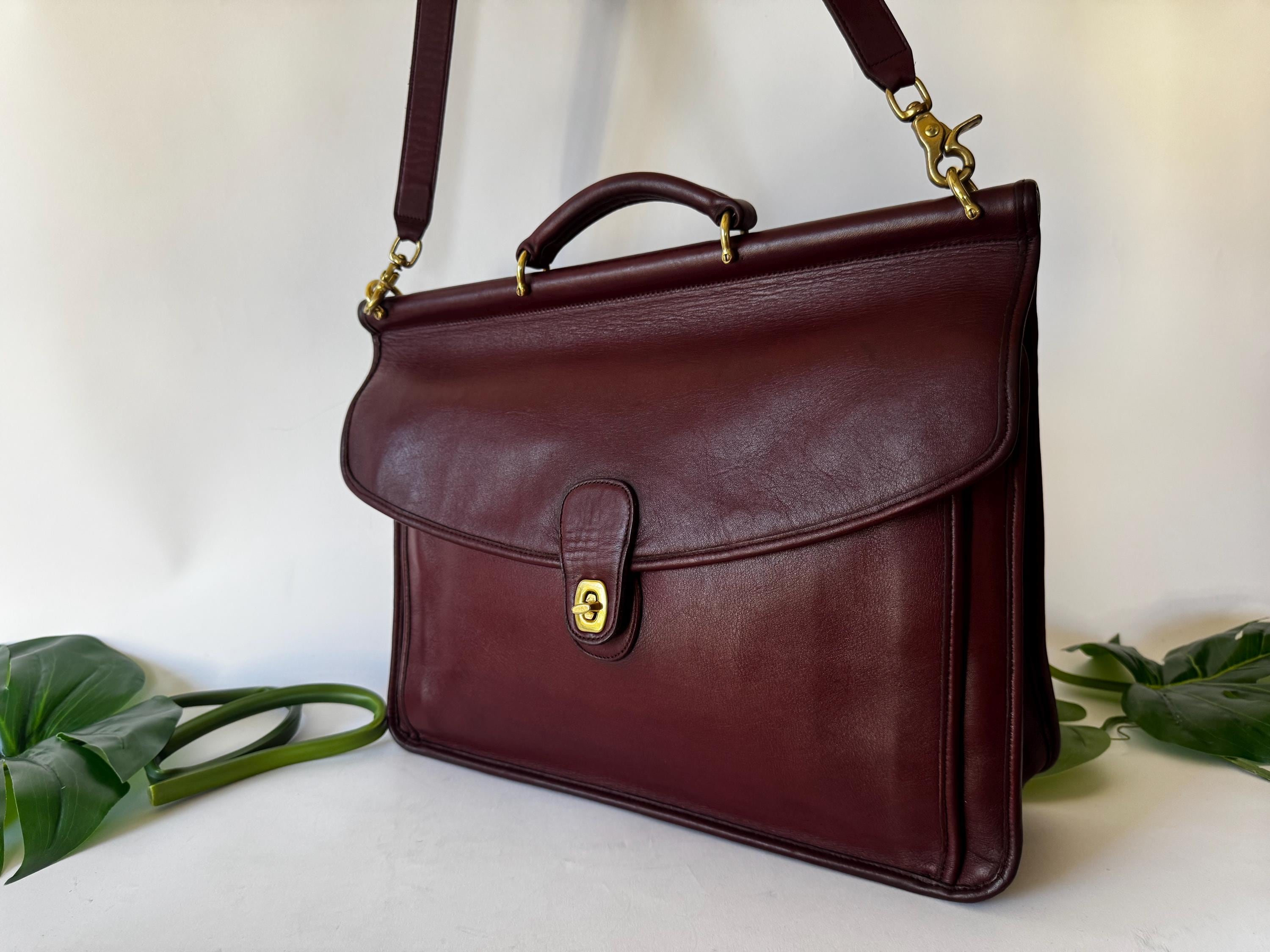 Features: Adjustable shoulder strap Brasst urn closure Brass lobster clasps strap Top Handle Exterior back pocket is perfect for files & paperwork Two Interior compartments Interior slip pocket Memo pad pocket, card pocket & pen holder Great for a laptop