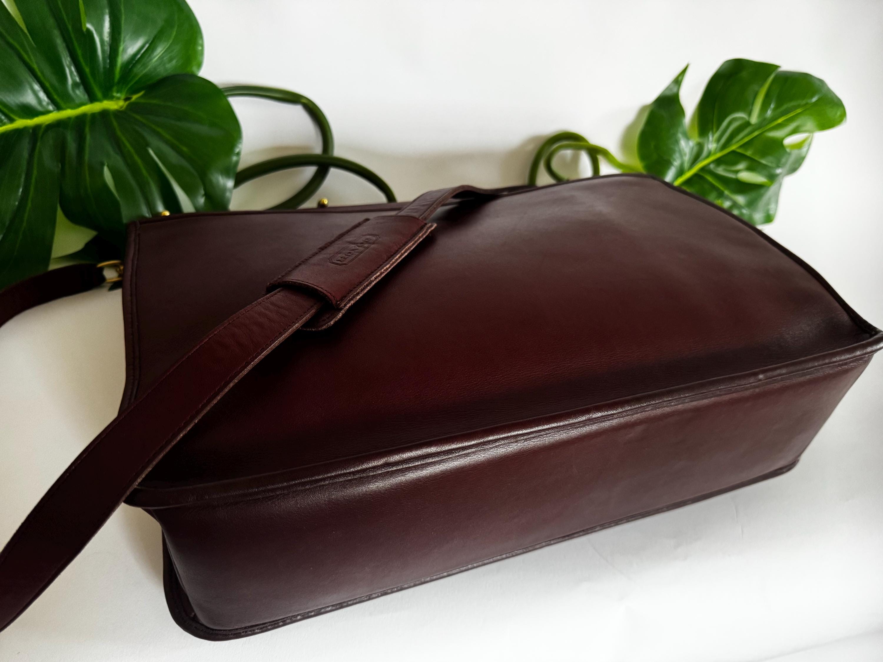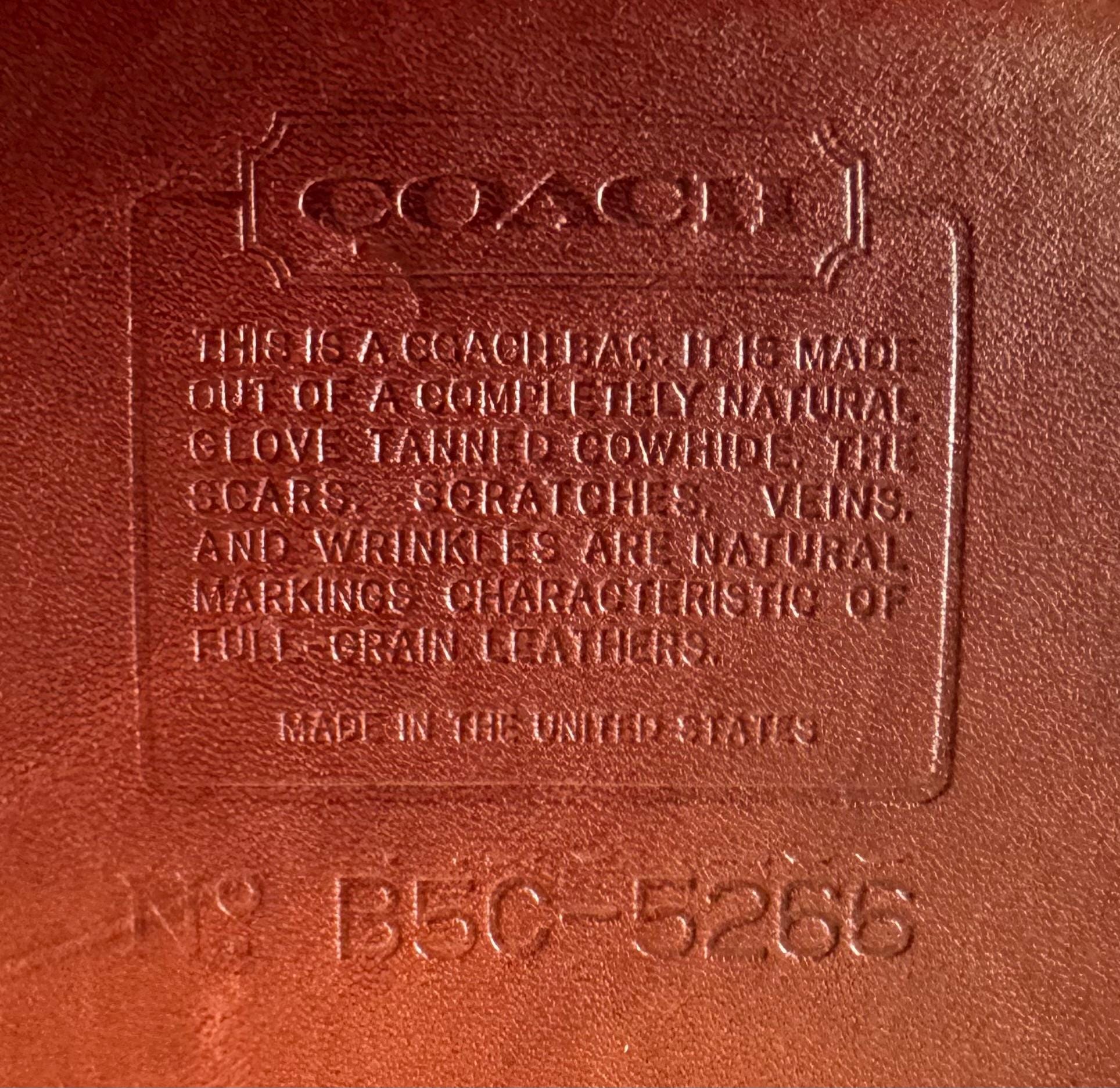 This Coach bag is made of thick, soft, and smooth leather with brass hardware. It is marked with an embossed creed and serial number, indicating that it was made in the USA
