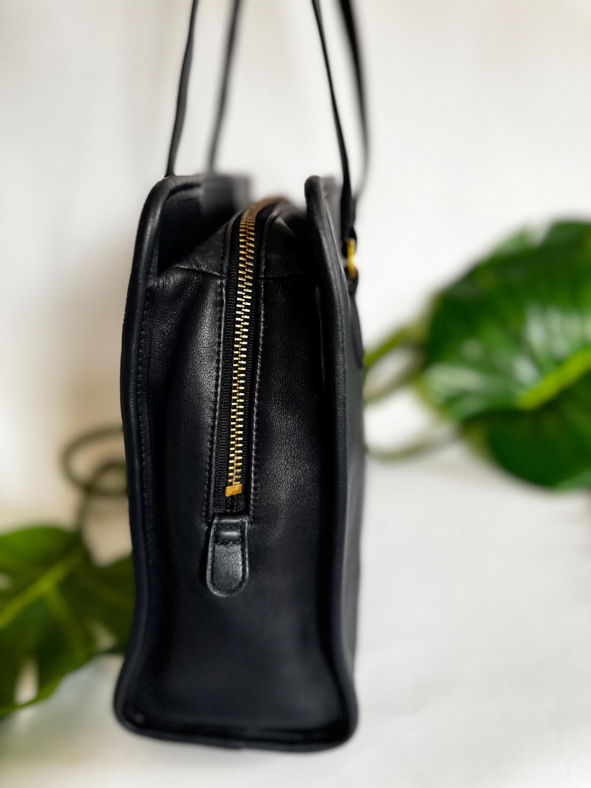 Features: -3 compartments -Center zippered compartment -2 open compartments -Medium-sized non-structured bag -Same design on both sides -Leather Double handles -Non-removable strap with a 13 inch drop
