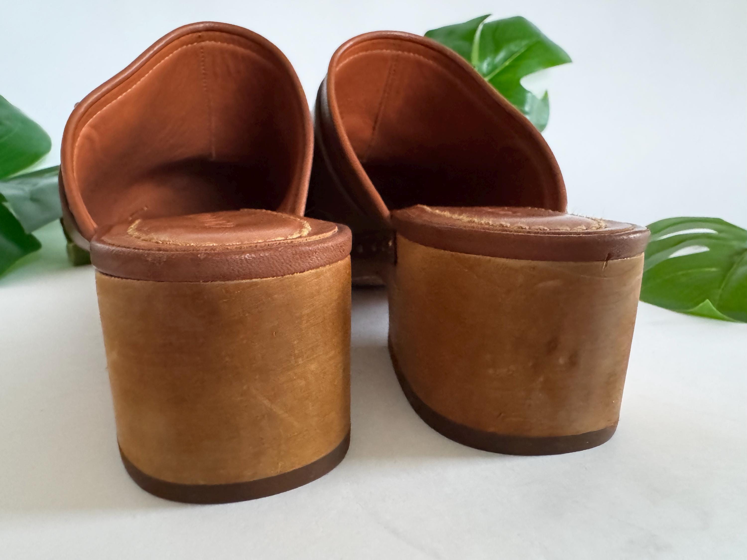 Features: -Leather upper -Leather lining and footbed -Rubber outsole -Slip on -Brass turnkey -1 3/4" wooden heel - 1/2" platform -model number G2194
