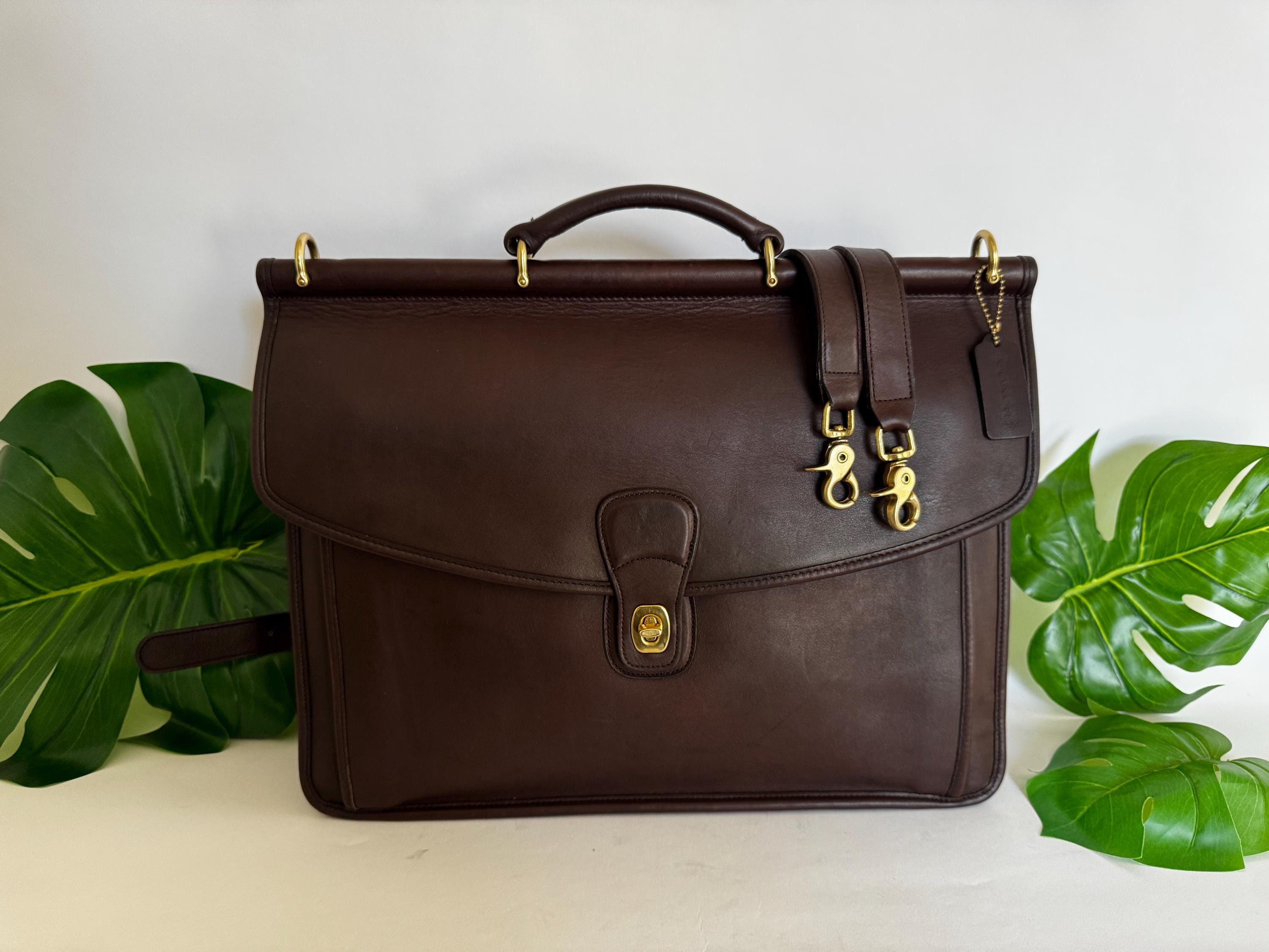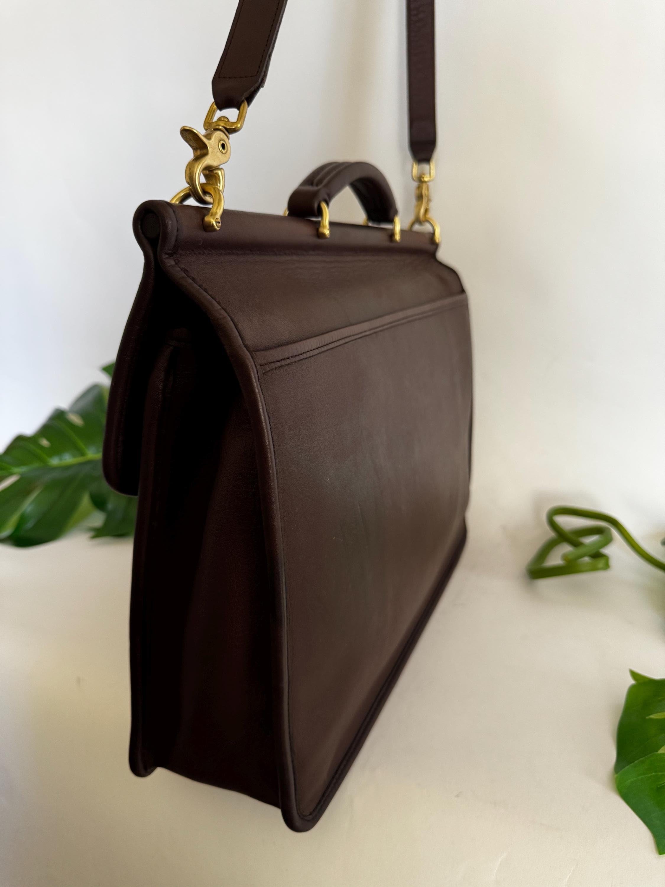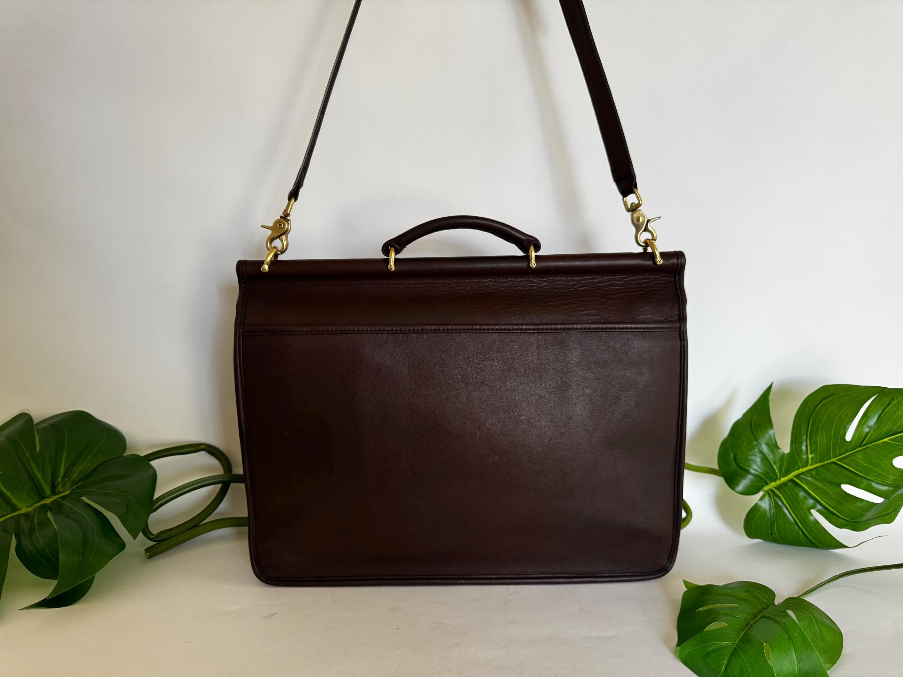 Features: Adjustable shoulder strap Brass turn closure Lobster claw clasps Top Handles Exterior back pocket is perfect for files & paperwork Two Interior compartments Interior slip pocket Memo pad pocket, card pocket & pen holder Great for a laptop