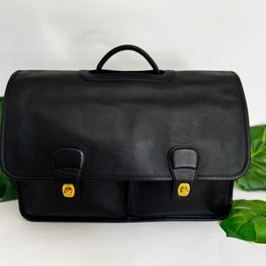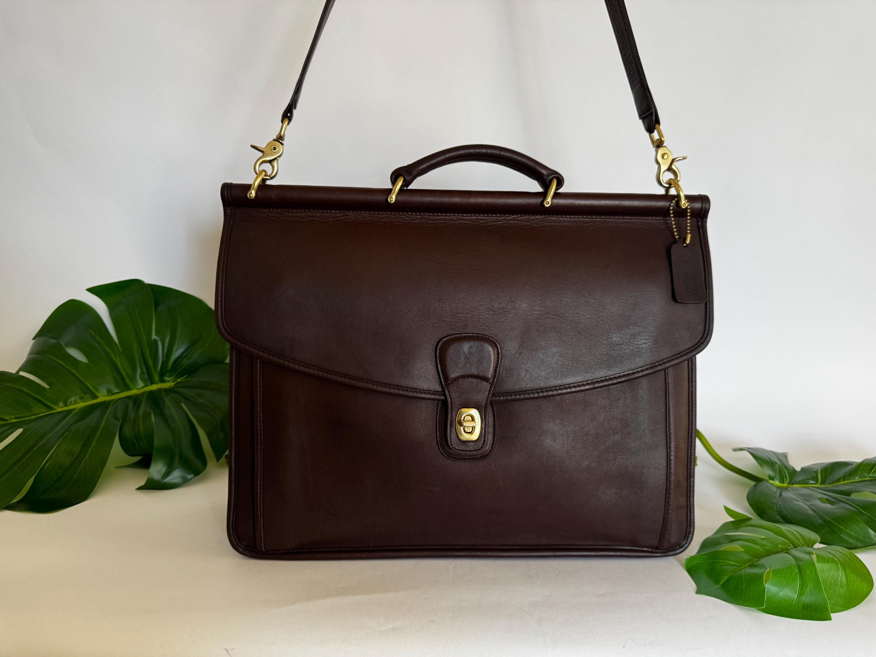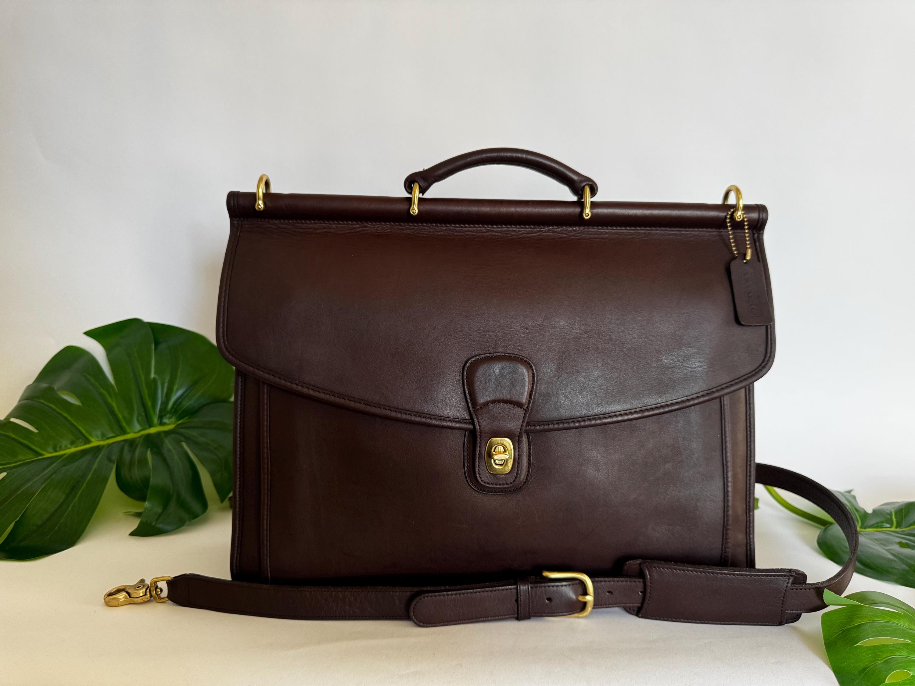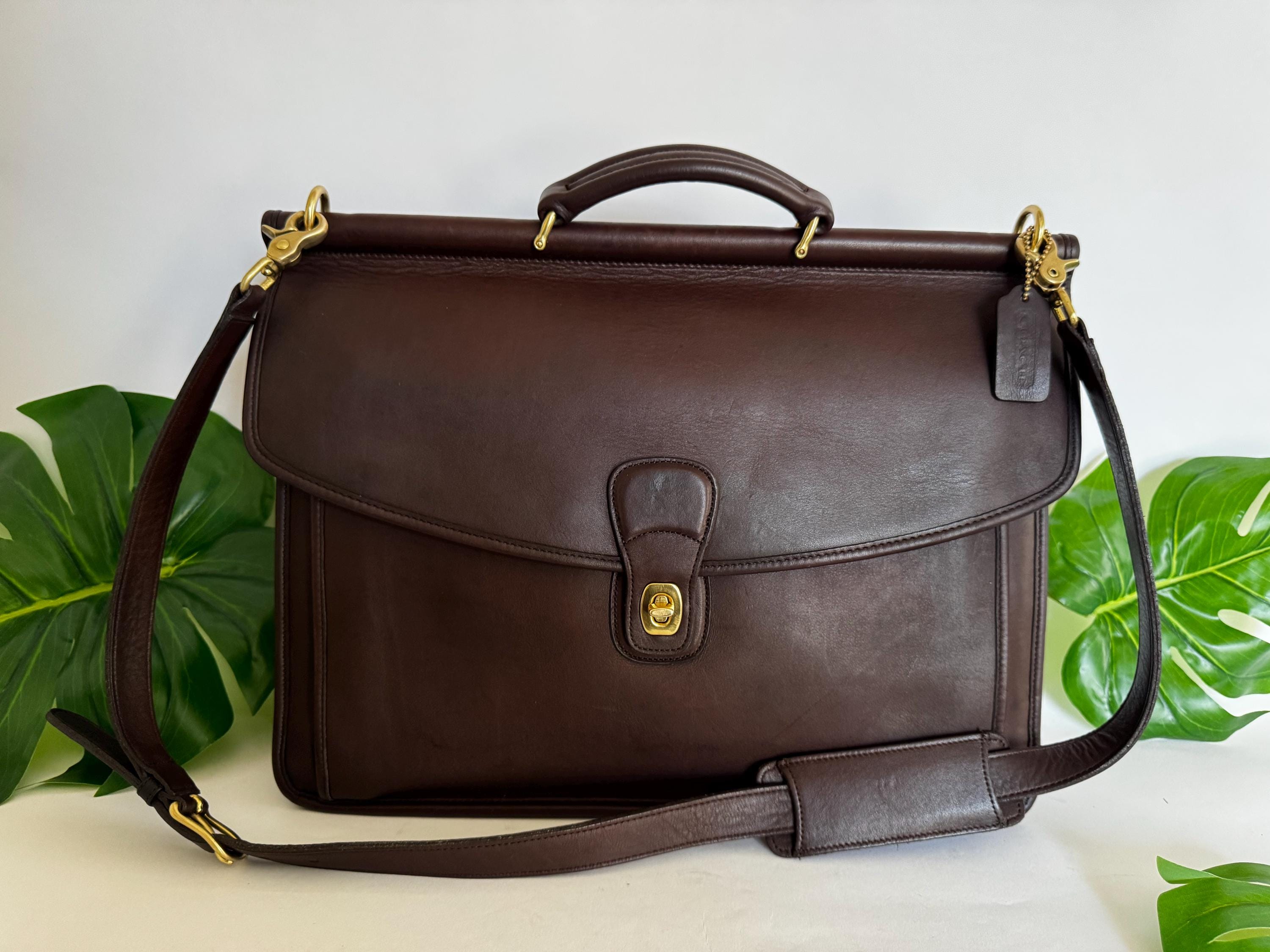 Features: Adjustable shoulder strap Brass turn closure Lobster claw clasps Top Handles Exterior back pocket is perfect for files & paperwork Two Interior compartments Interior slip pocket Memo pad pocket, card pocket & pen holder Great for a laptop