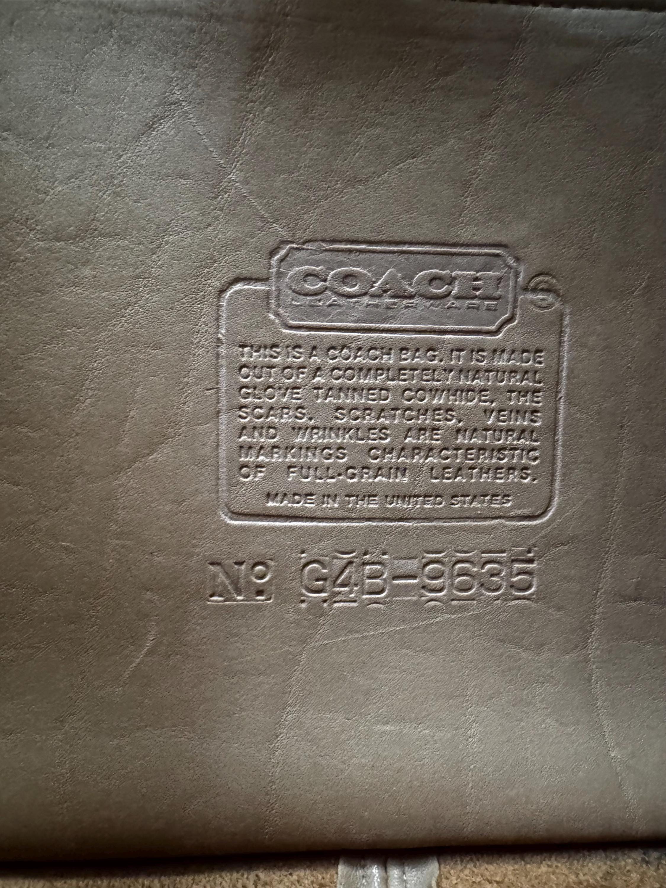 This Coach bag has thick, soft, and smooth leather with brass hardware. It is marked with an embossed creed and serial number indicating this bag was made in the USA