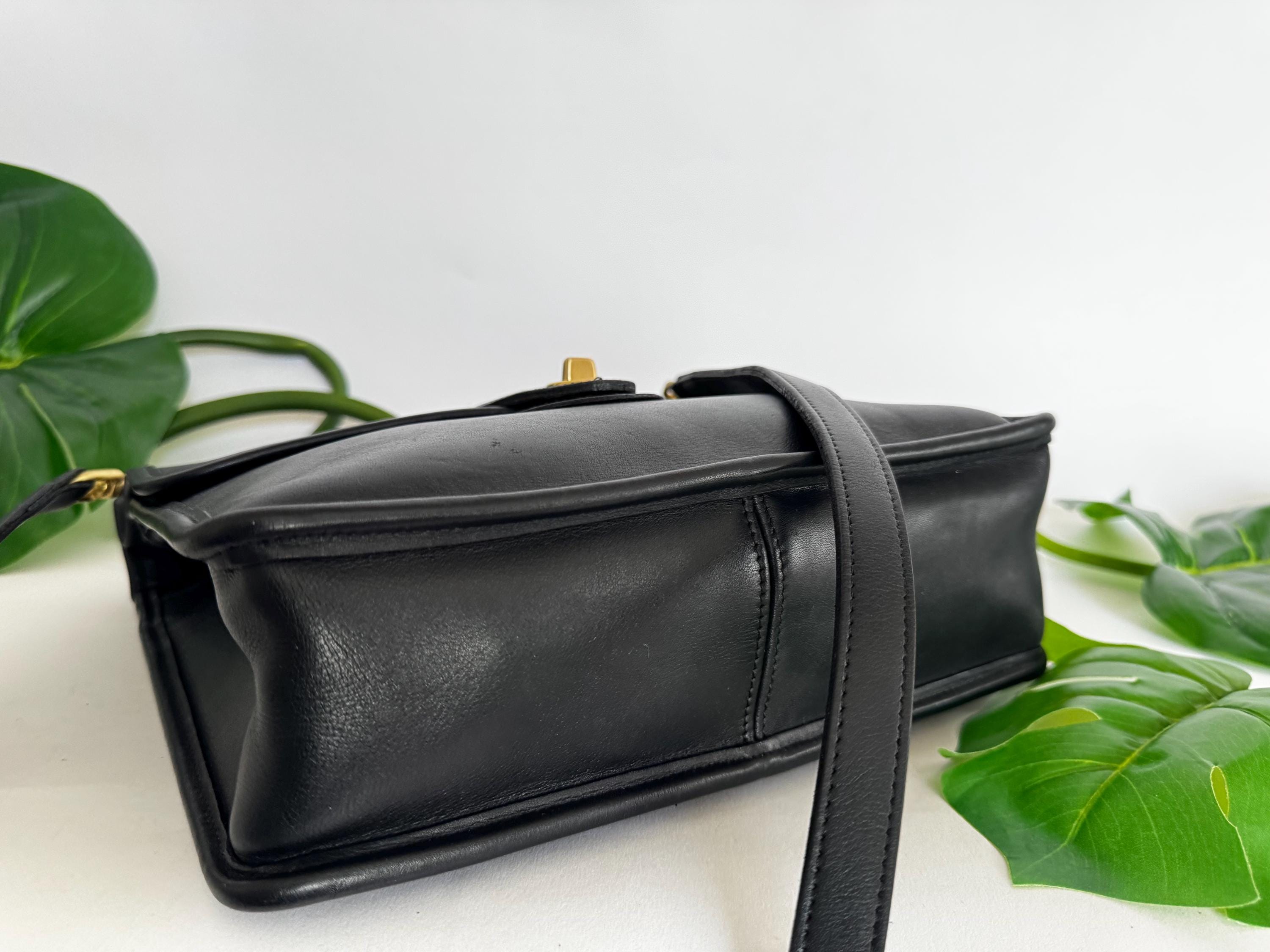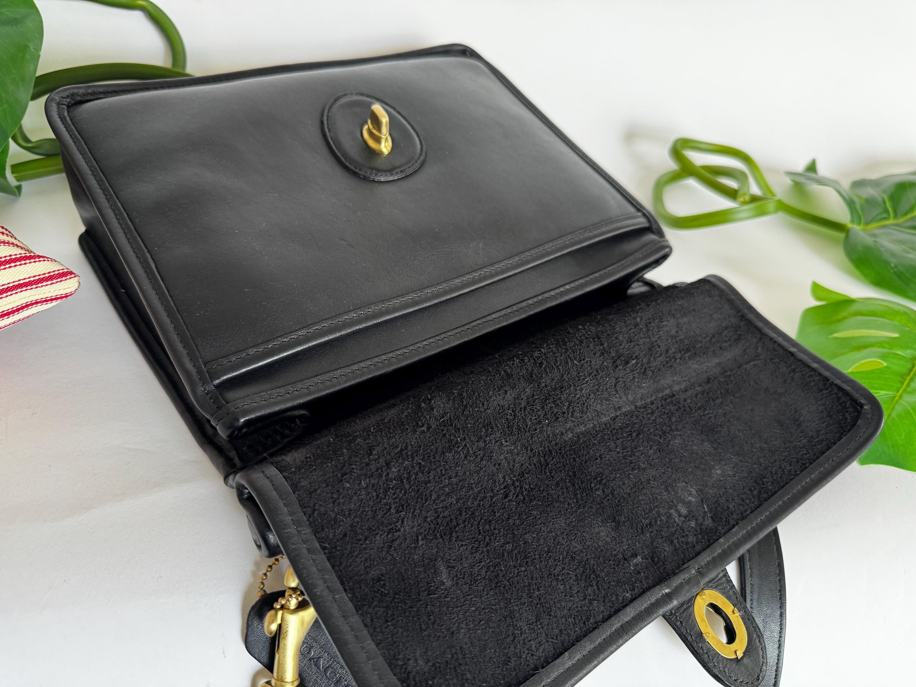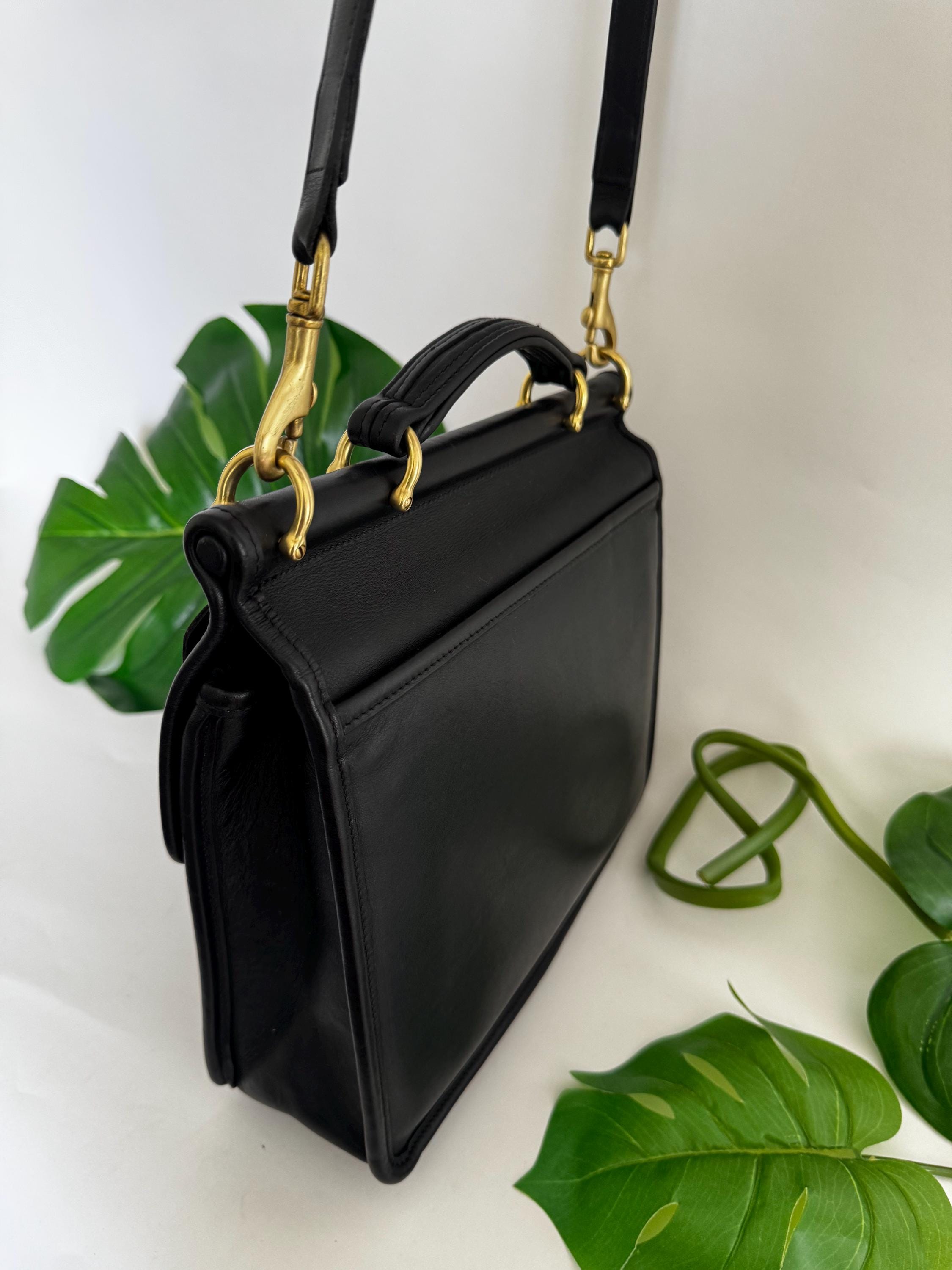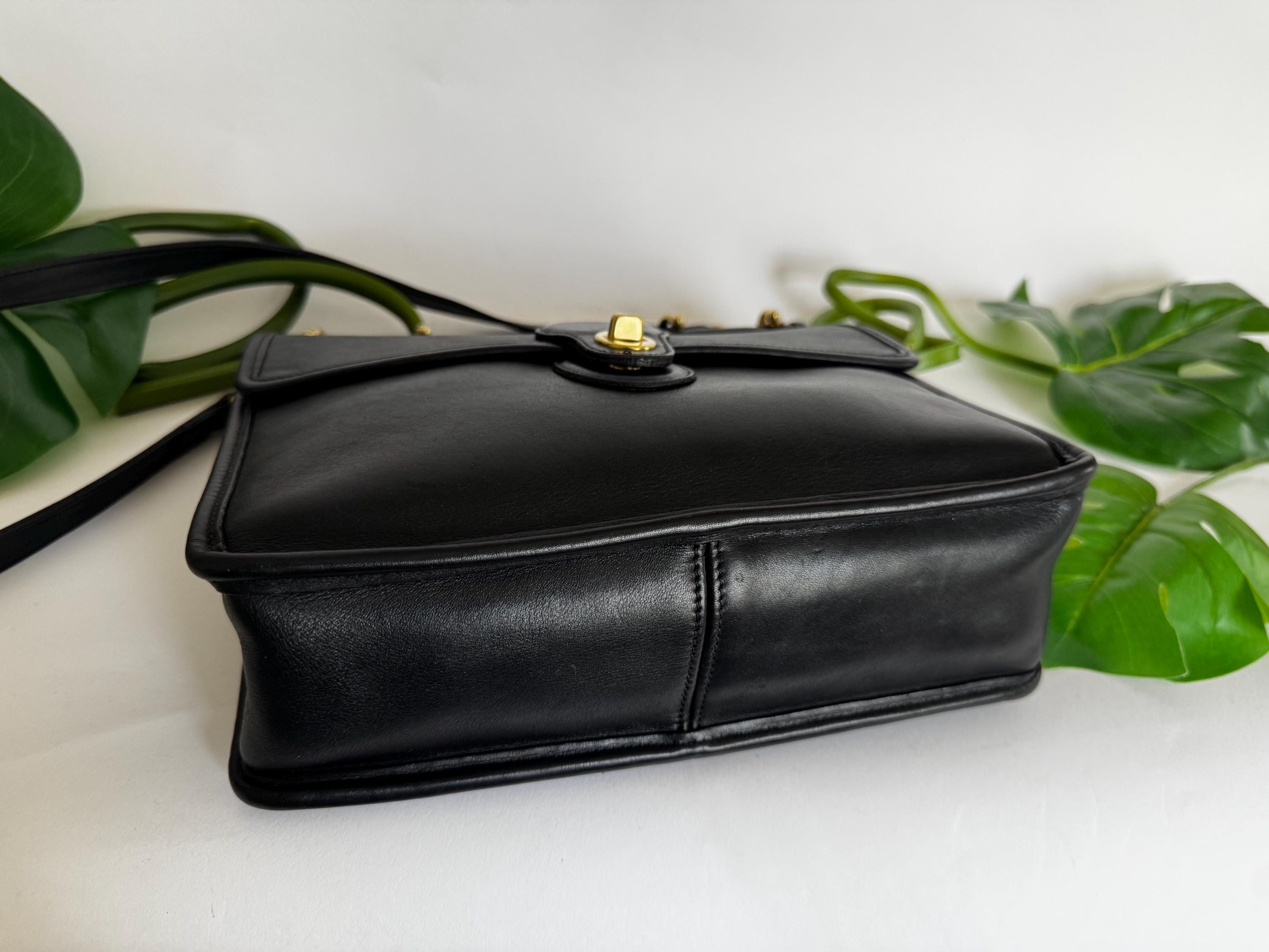 This Coach bag has thick, soft, and smooth leather with brass hardware. It is marked w/ an embossed creed and serial number indicates this bag was made in the USA in 1997