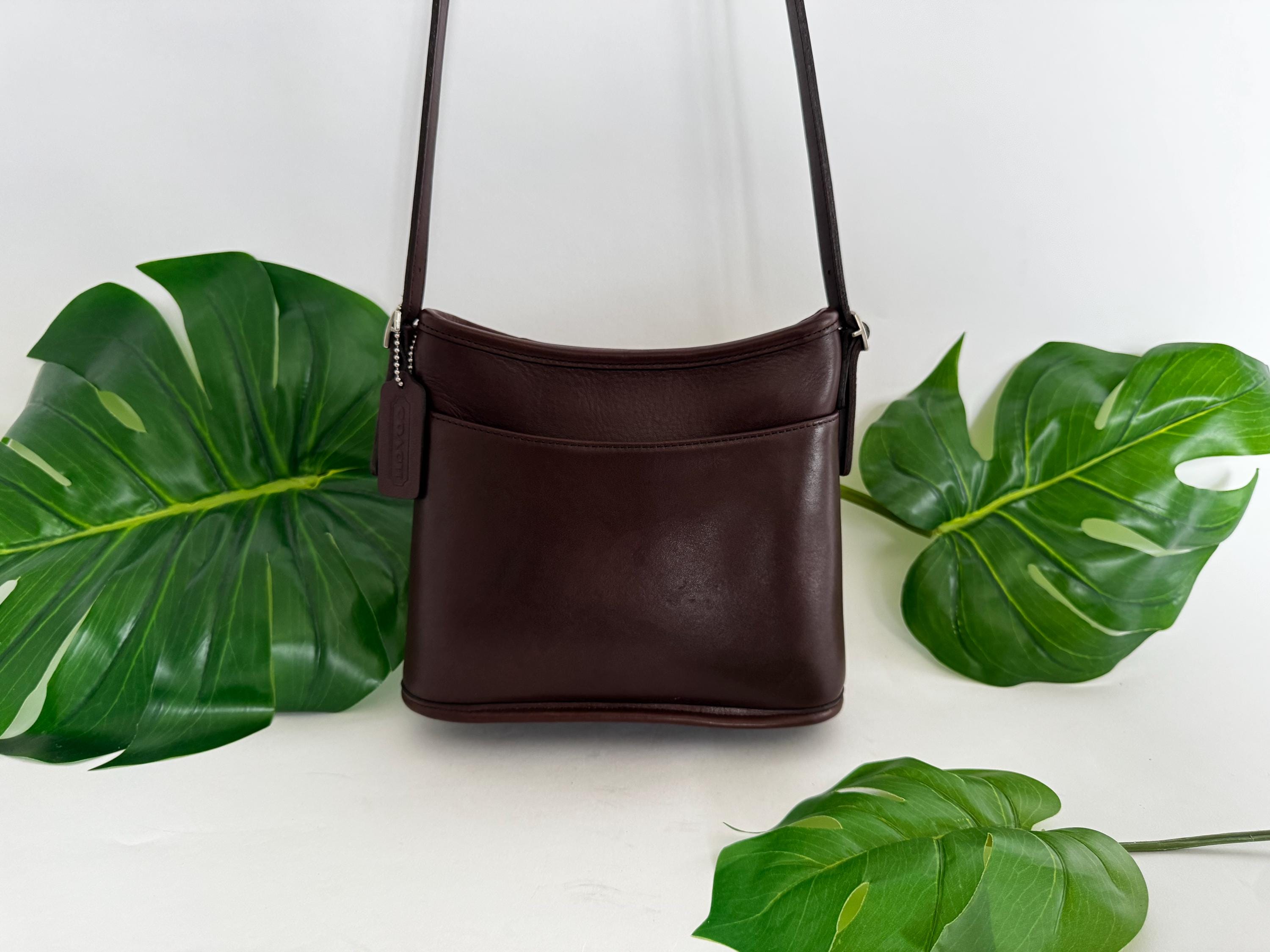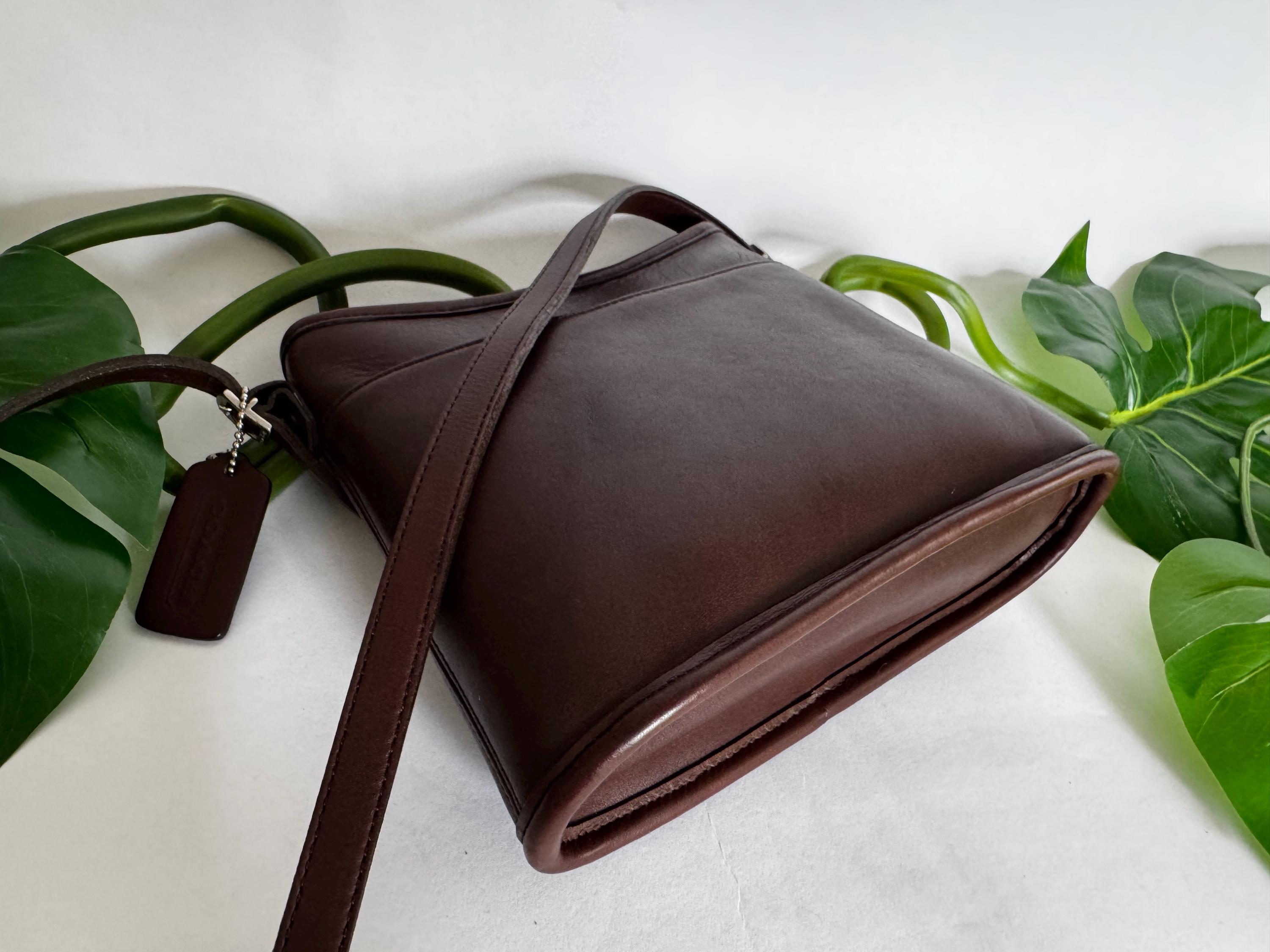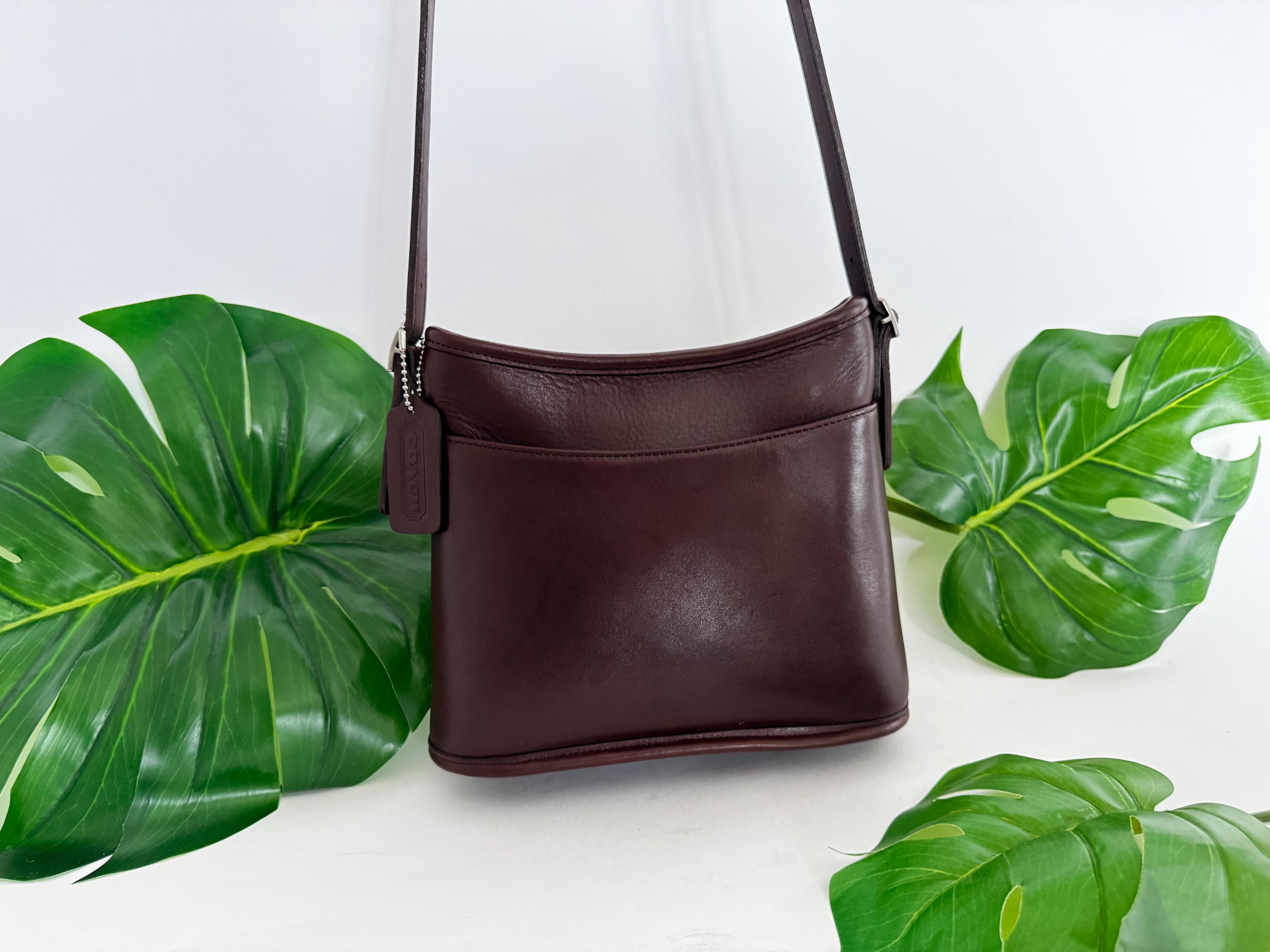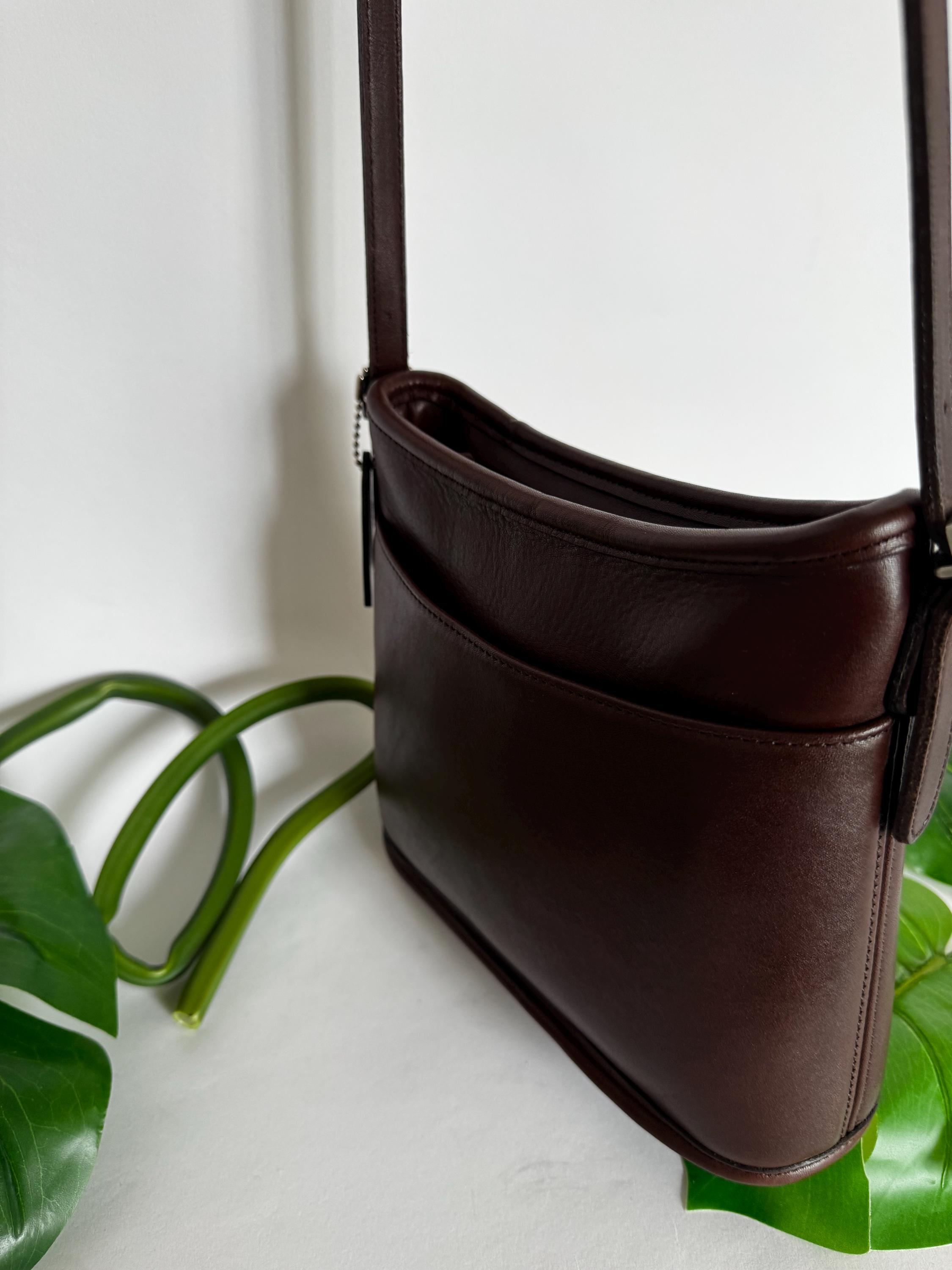 This Coach bag has thick, tanned, gloved leather that is soft and smooth. Solid brass hardware. It is marked w/ an embossed creed/label that indicates this bag was made in the USA before 1998