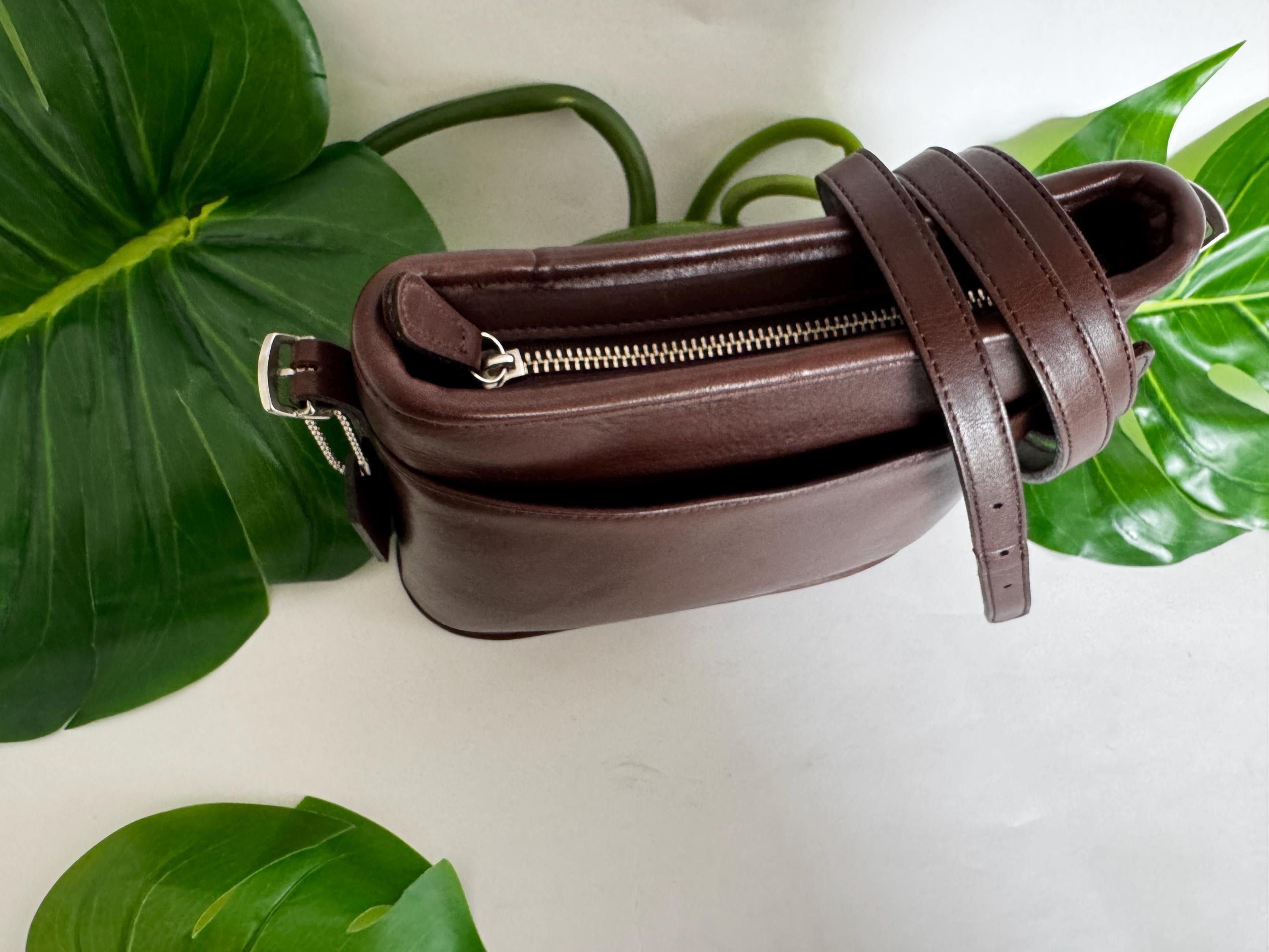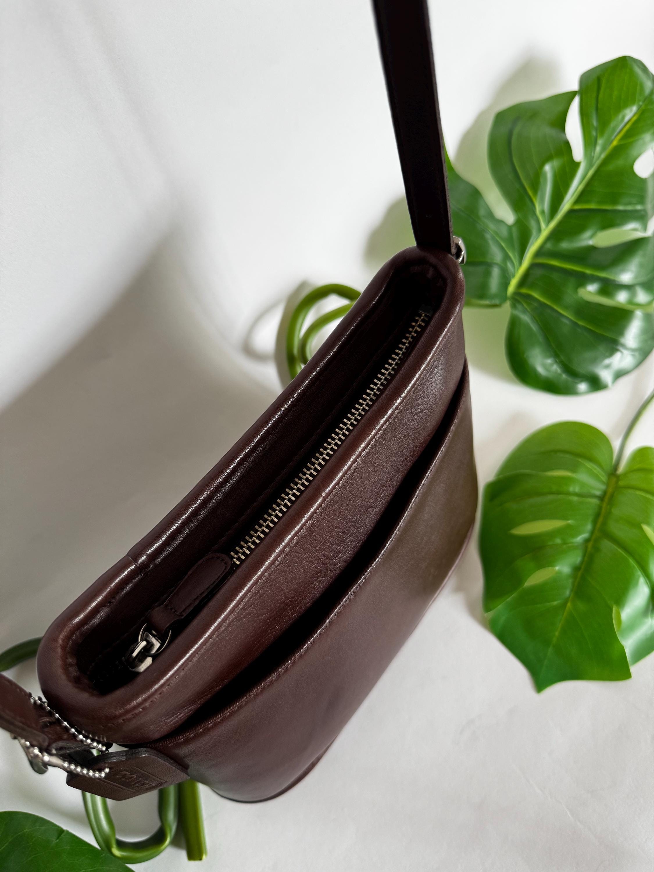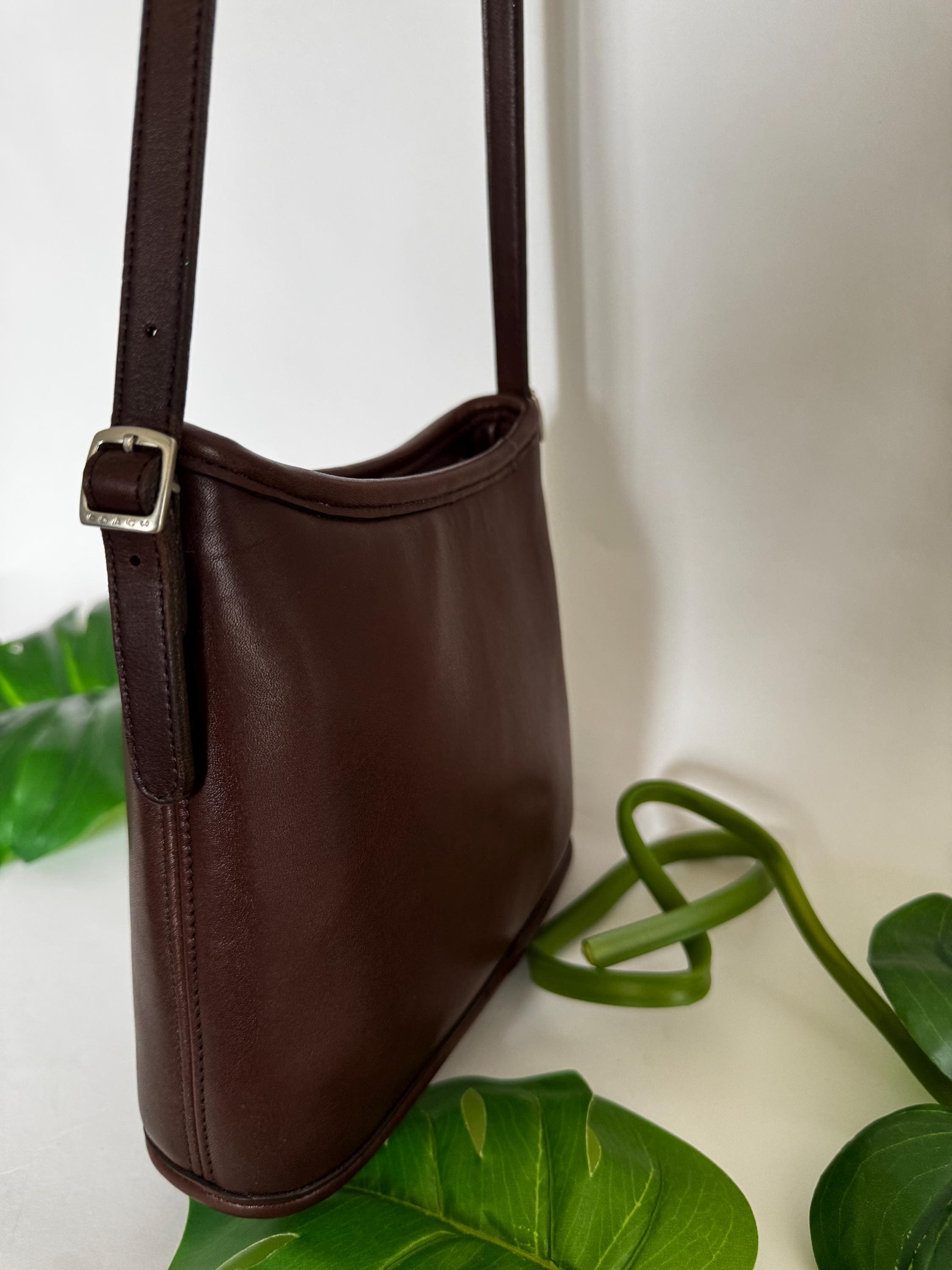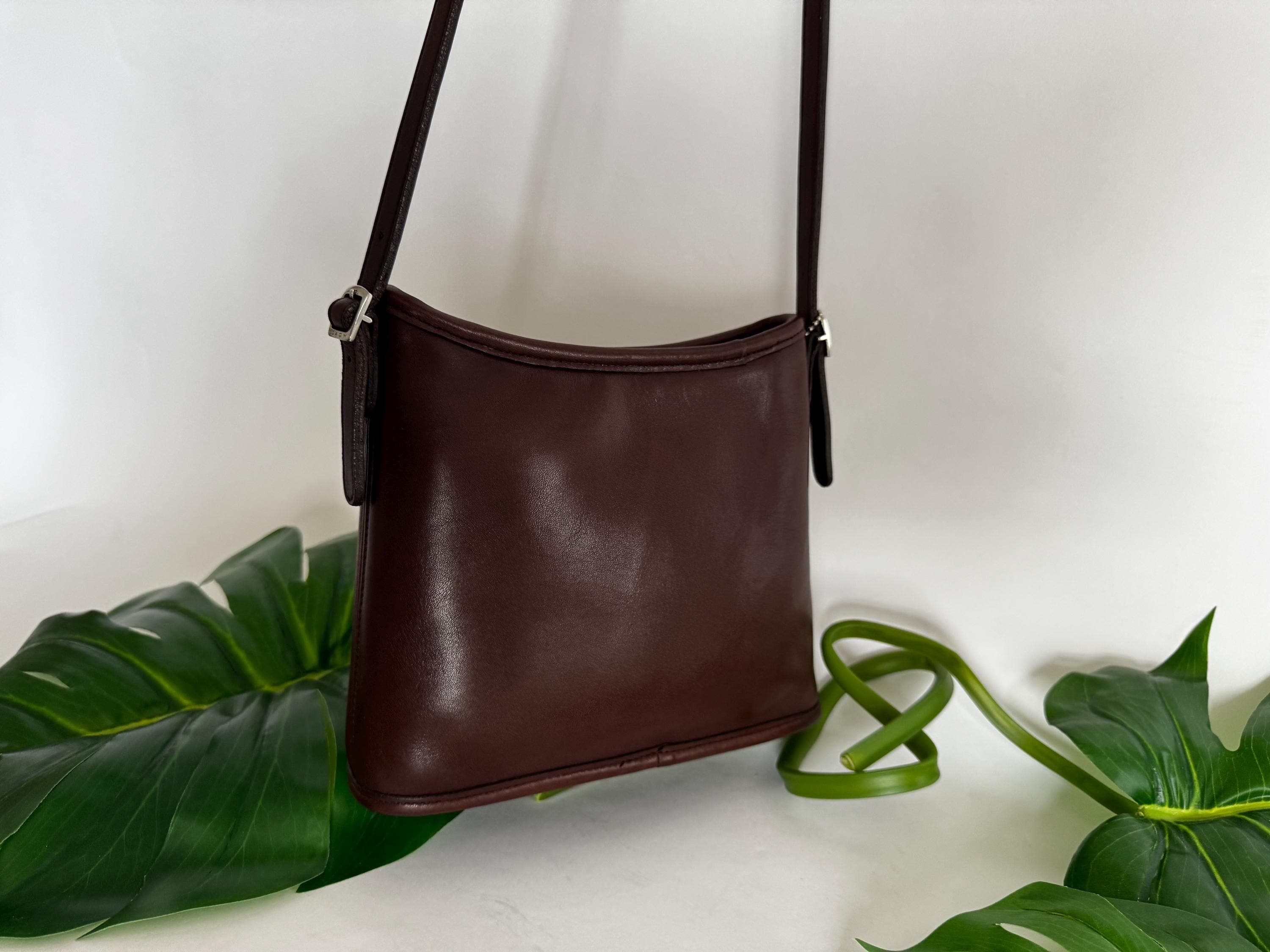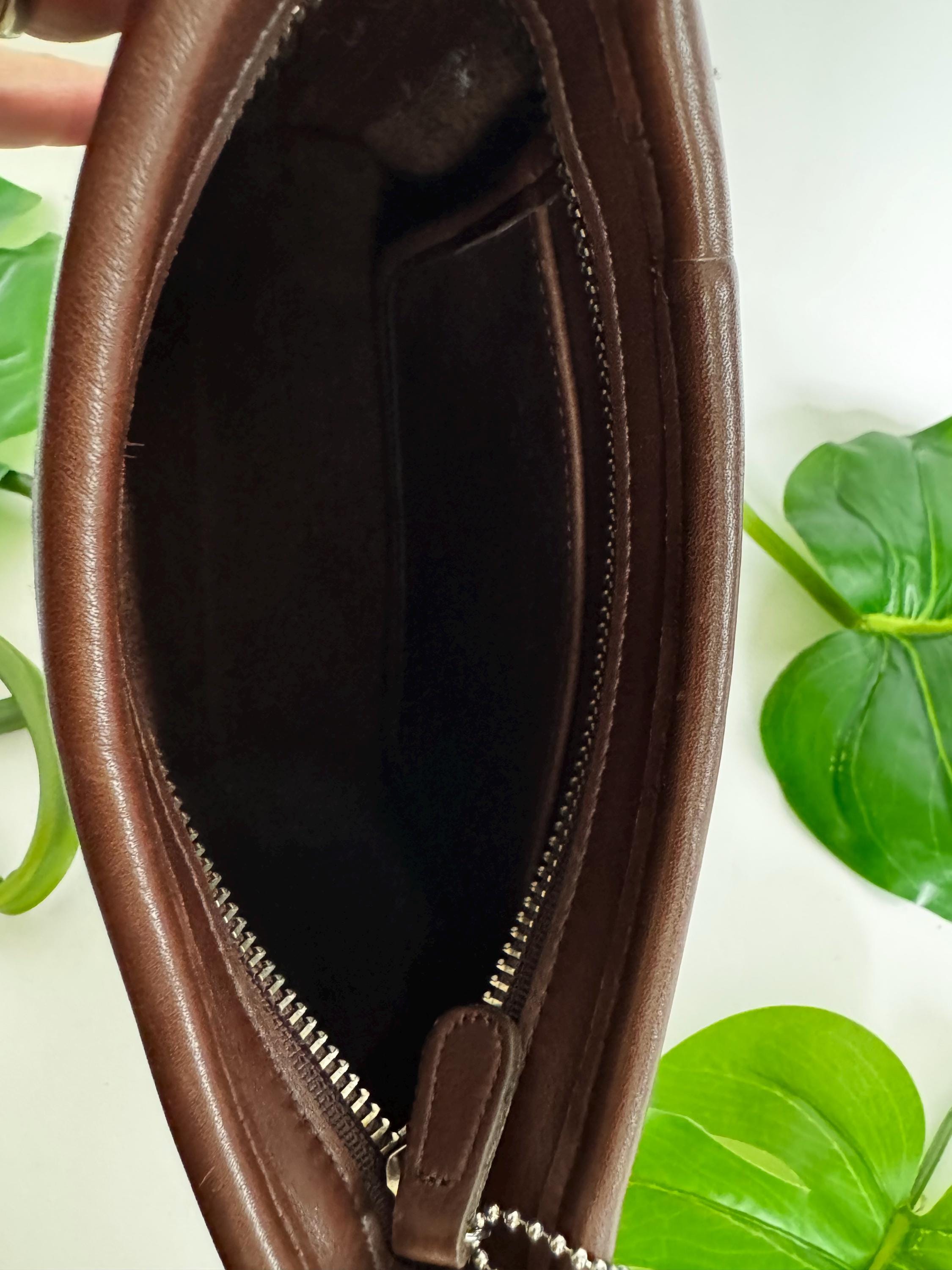 Features: One main compartment Zipper closure Exterior slip pocket Interior pocket Removable shoulder strap with brass clasps, 22" Cleaned, conditioned & ready to use!