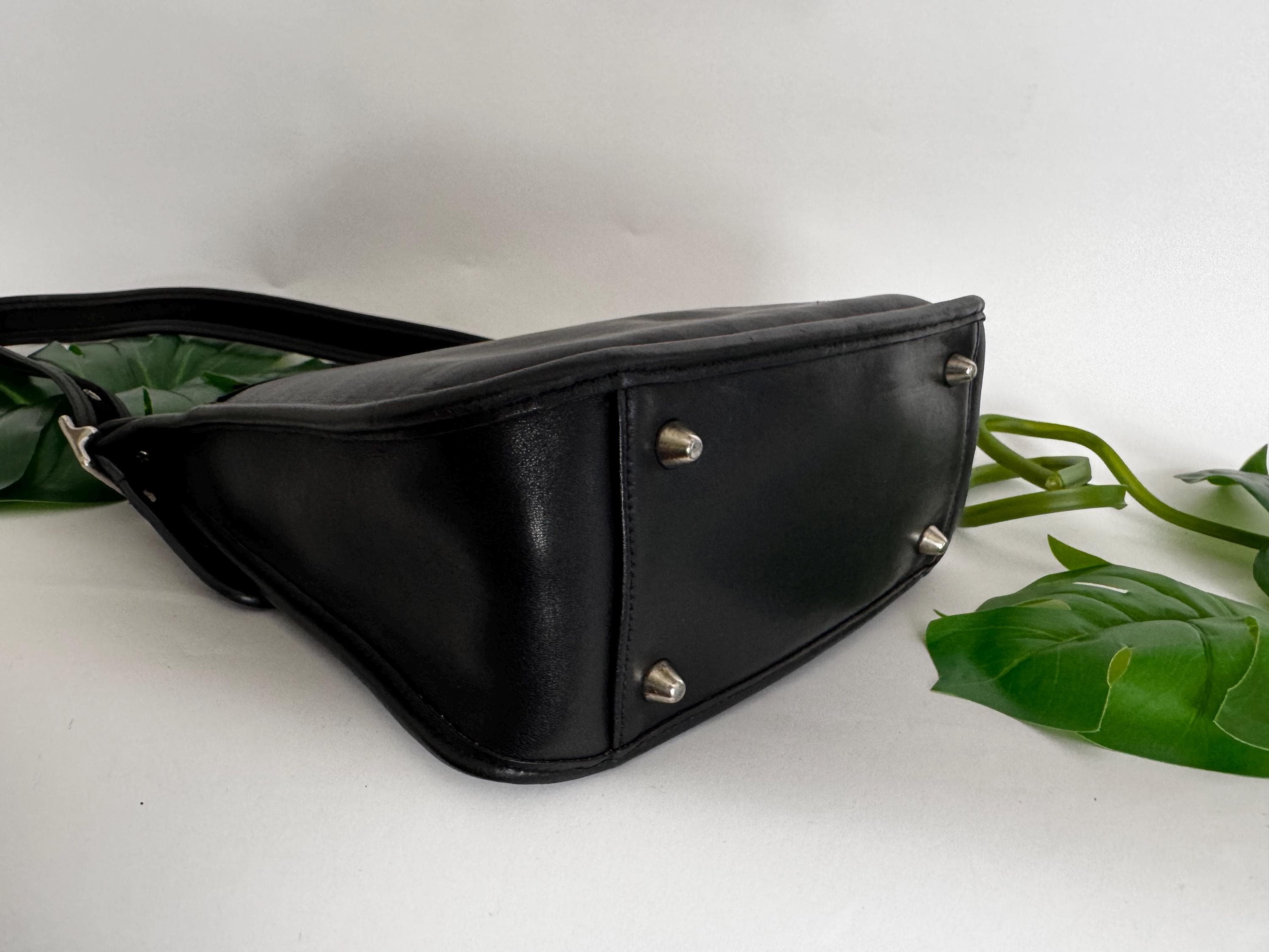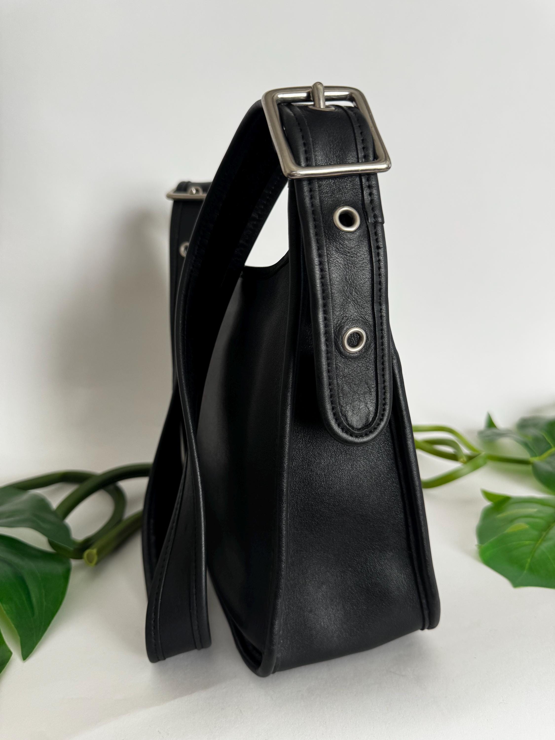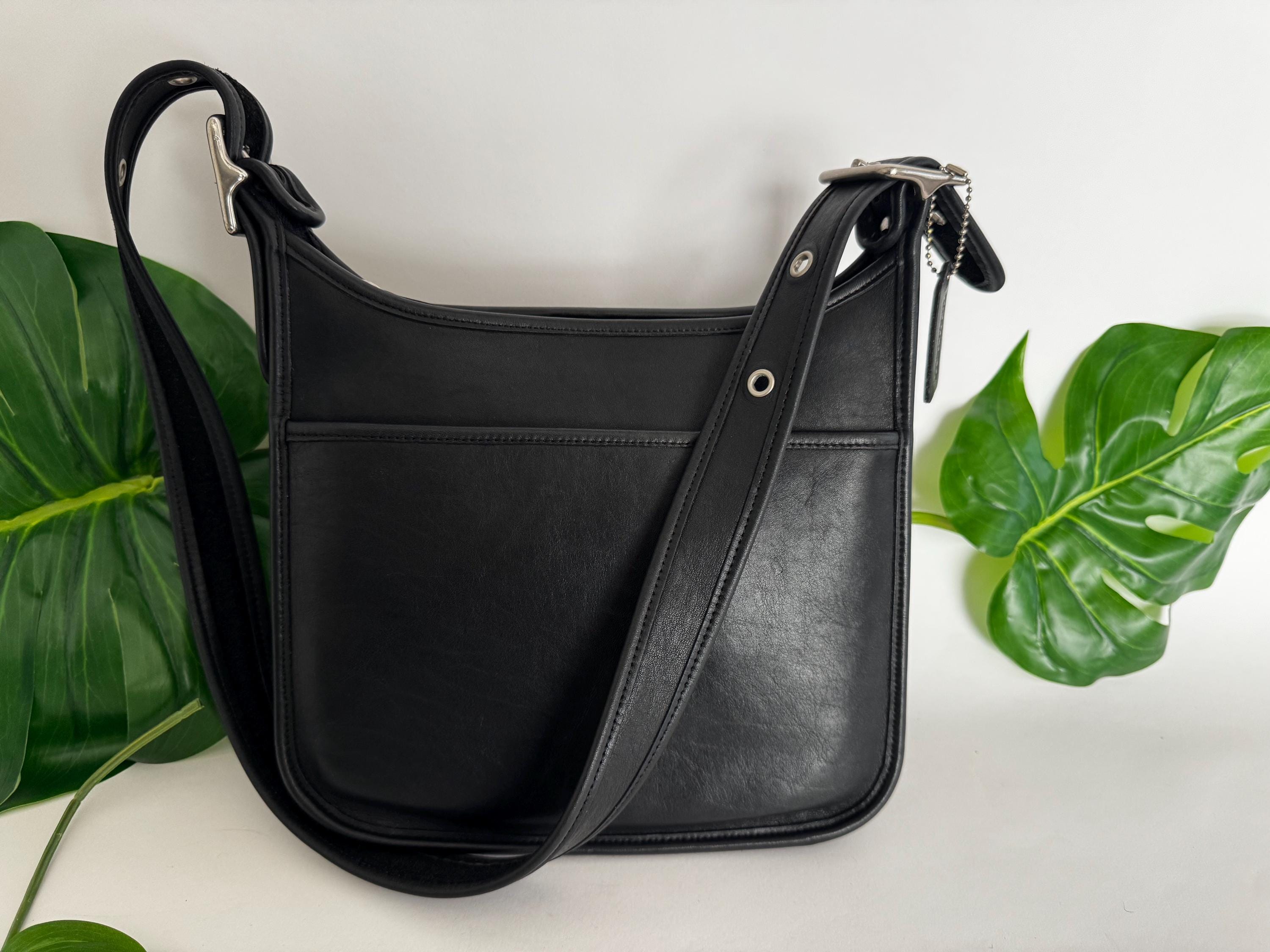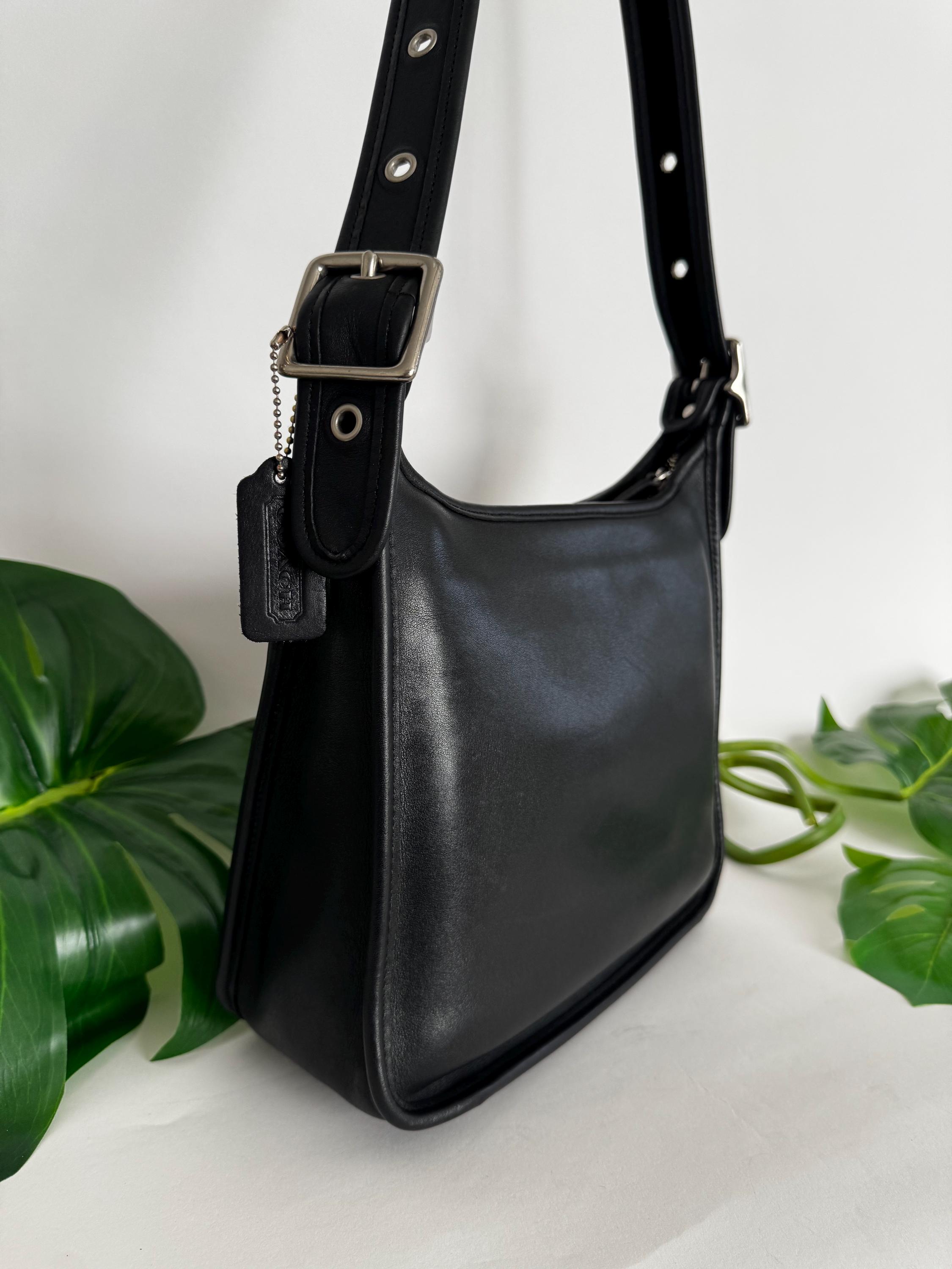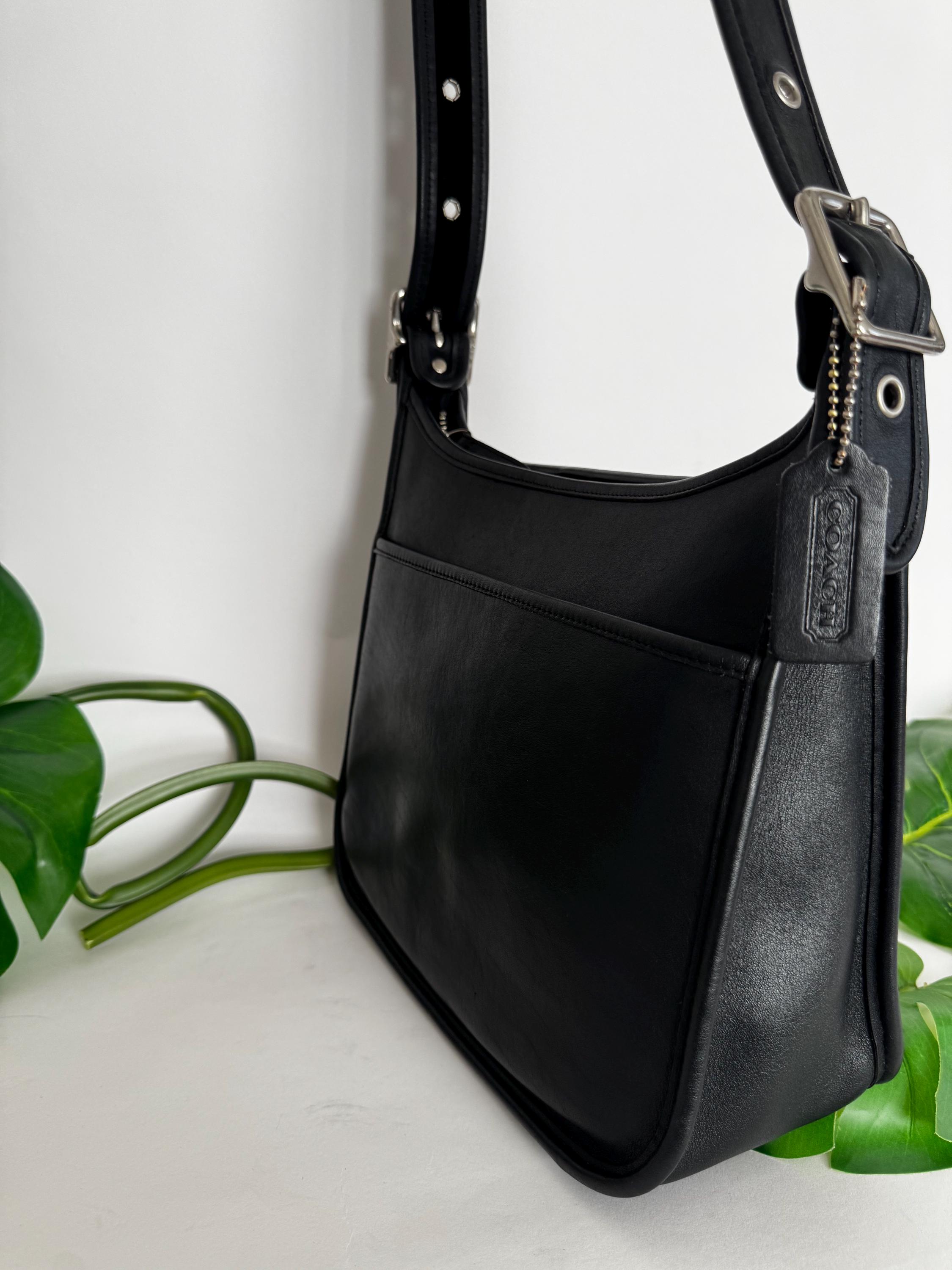 Features: -Iconic industrial silver zipper -Zip closure -Interior slip pocket with additional pockets to hold several pens, another small slip --Pocket for cards -Exterior slip pocket -Silver feet on the bottom of the bag -Very roomy— could hold a bottle of water, wallet, book, and scarf -Adjustable strap, 20”-23“ drop -Cleaned, conditioned & ready to use!