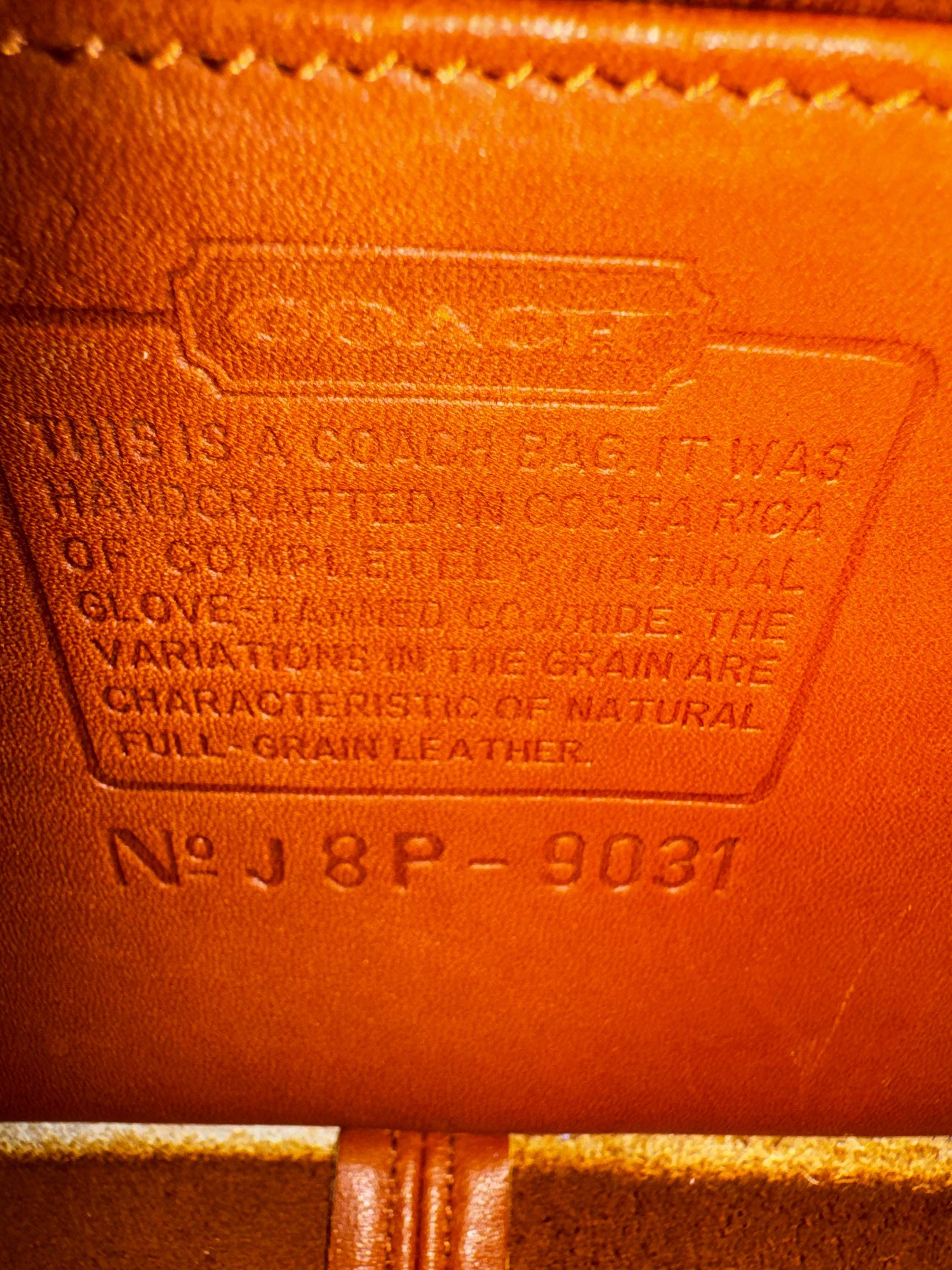 Coach bag has thick, soft, and smooth leather. It is marked w/ an embossed creed and serial number that indicates this bag was made in Costa Rica